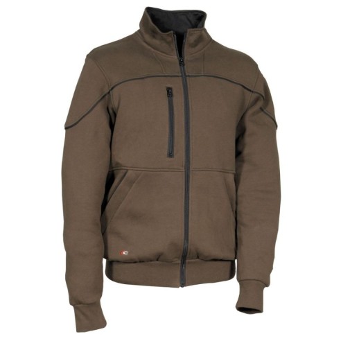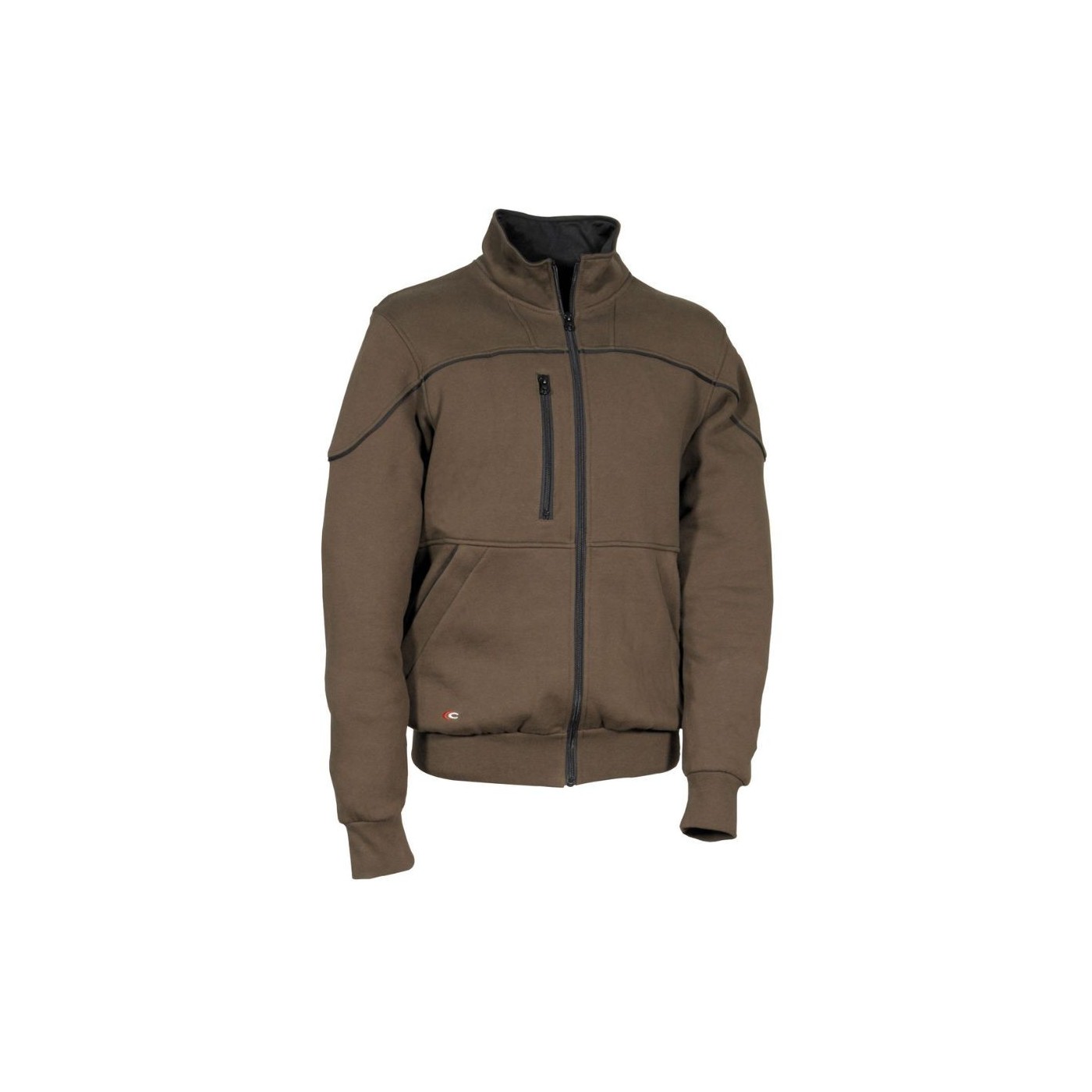 Sweat-shirt zippé avec bordures contrastées. Il possède plusieurs poches très pratiques : sur la poitrine et deux grandes poches latérales sur le bas, toutes avec fermetures éclair. Manches et taille élastiquées pour un meilleur ajustement. Coudes renforcés.