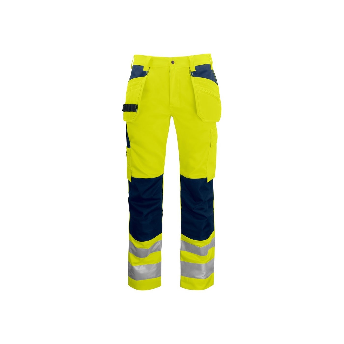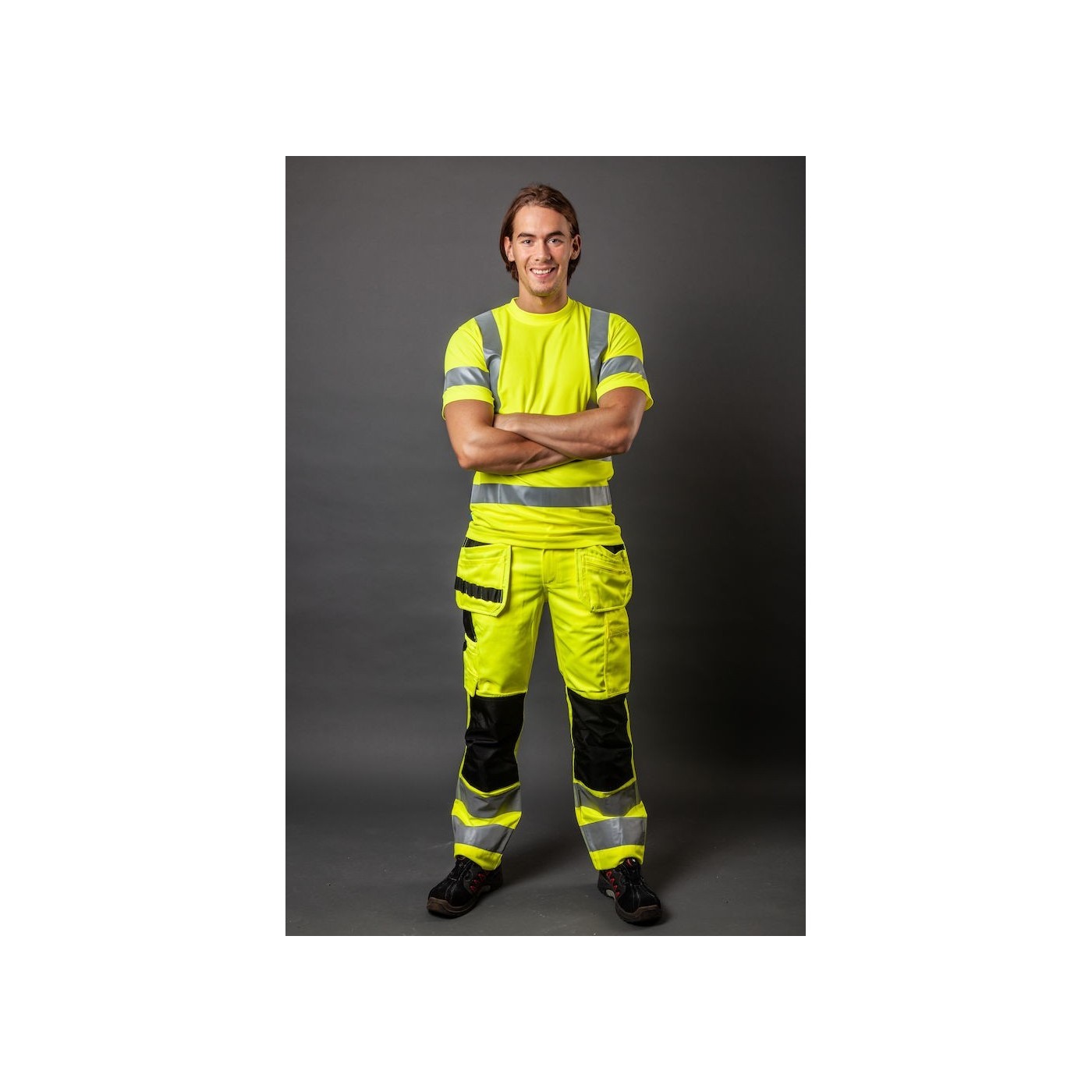 Pantalon de classe 2 en polyester / coton Entretien facile. Poches arrière avec rabat et fermeture Velcro. Poche sur la jambe avec espace pour mobile, poche pour stylos et outils. La protection du genou peut être ajustée à deux niveaux. Renforts dans les poches et la protection. Les tailles C42-C64 peuvent être prolongées d'environ 5 cm.