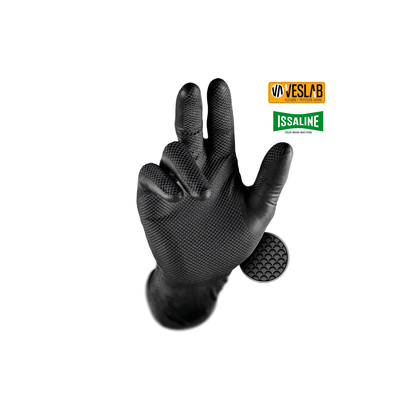 Gants Grippaz d'Issa Line : robustes, polyvalents et avec une adhérence supérieure. Ils sont conformes aux normes EN ISO 374-1:2016, EN ISO 374-5:2016, EN 420:2003 + A1:2009, EN 1186 et AQL 1.5. Ces gants en nitrile brevetés présentent un motif en écailles de poisson qui améliore la traction et l'adhérence sur les surfaces huileuses et humides. De plus, ils sont compatibles avec les appareils à écran tactile et ne contiennent pas de silicone. Parfait pour l'inspection, l'assemblage, la maintenance, la réparation d'équipements, la peinture et les applications automobiles. Disponible en noir, dans les tailles du S au XL et présenté en boîte de 50 unités. Découvrez la qualité et les performances exceptionnelles des gants Grippaz d'Issa Line !