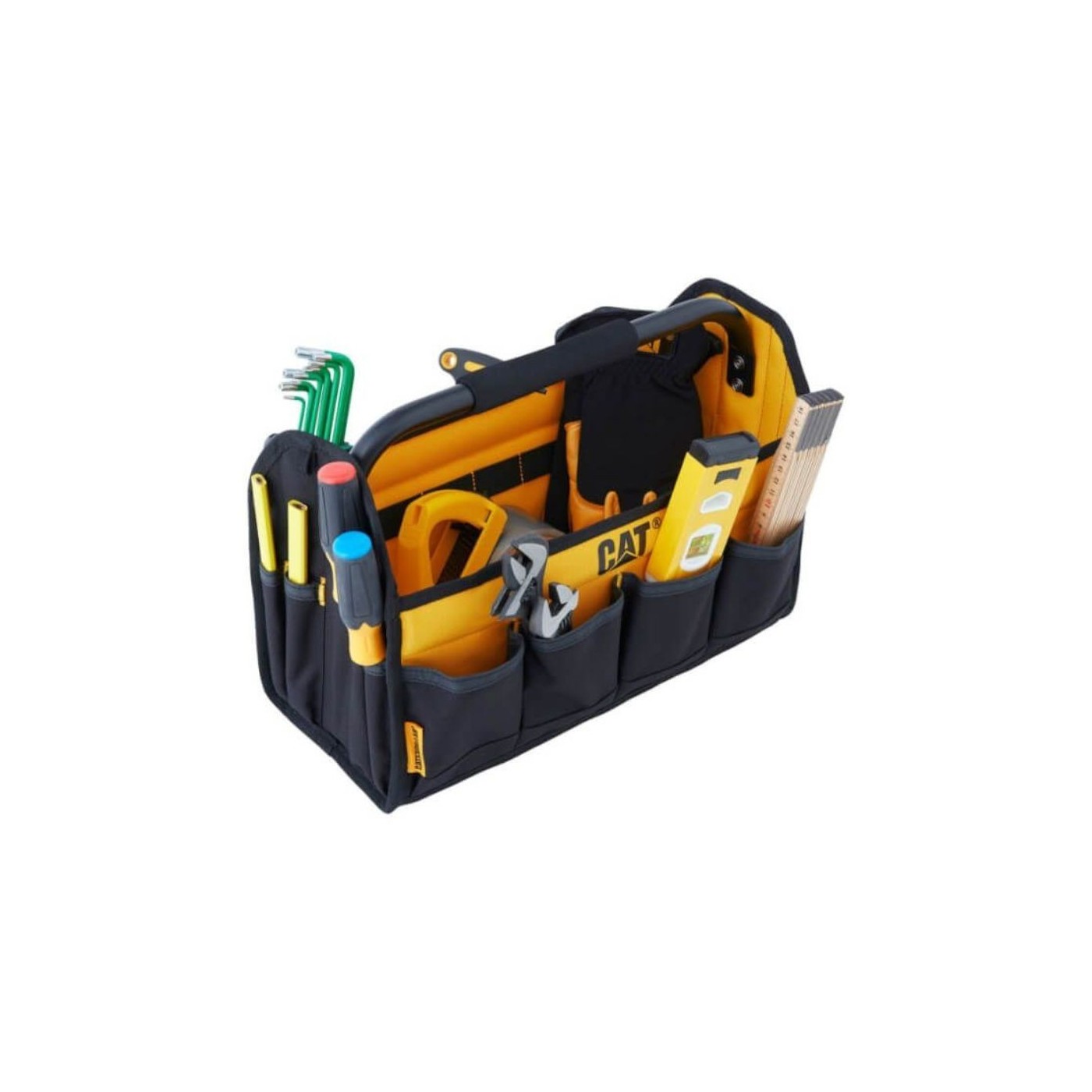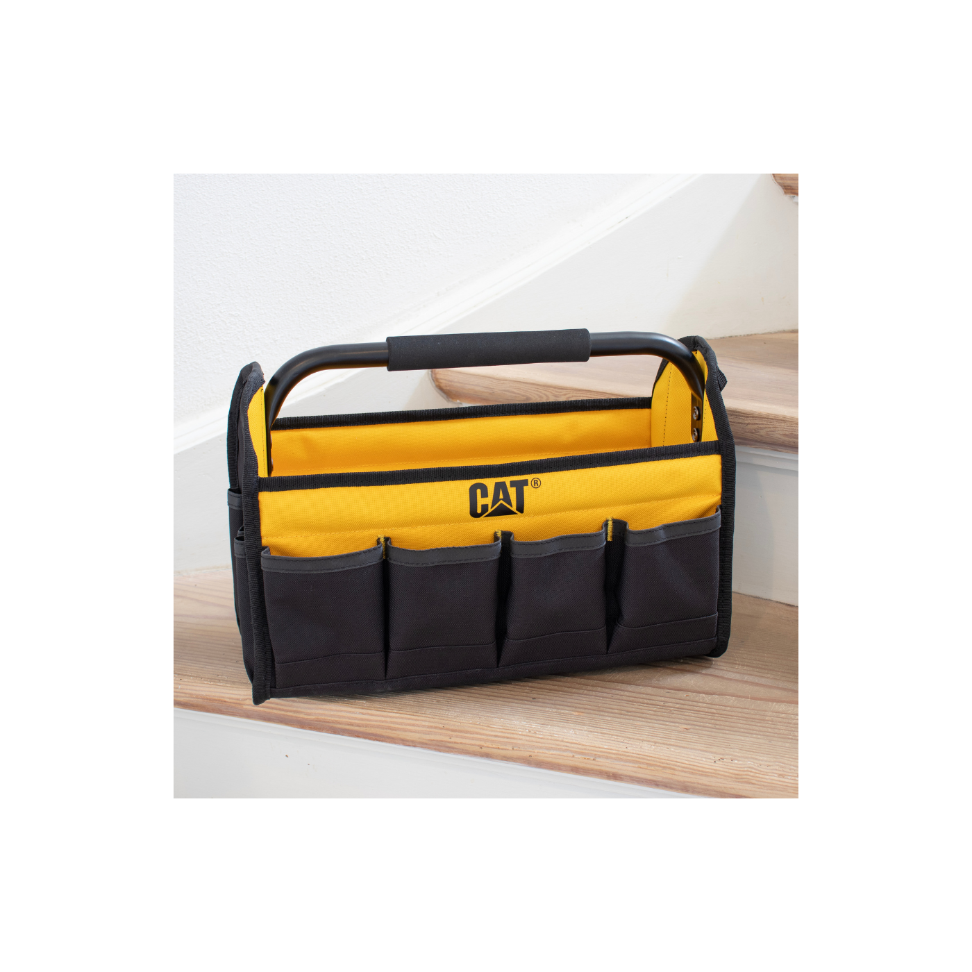 Boîte à outils ouverte CAT 15" GP-65045 avec 16 poches extérieures, une grande ouverture sur le dessus et une poignée métallique robuste. Compacte, pliable et ultra-résistante.