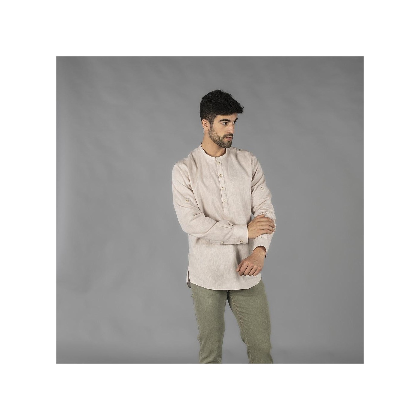 Chemise à col mao élégante et décontractée pour homme à manches longues et retroussable avec fermeture à boutons. Fabriqué en Plana 55% lin et 45% coton. Idéal pour les serveurs, le personnel de l'hôtel et toute activité ou entreprise qui souhaite fournir une image d'entreprise distinctive.