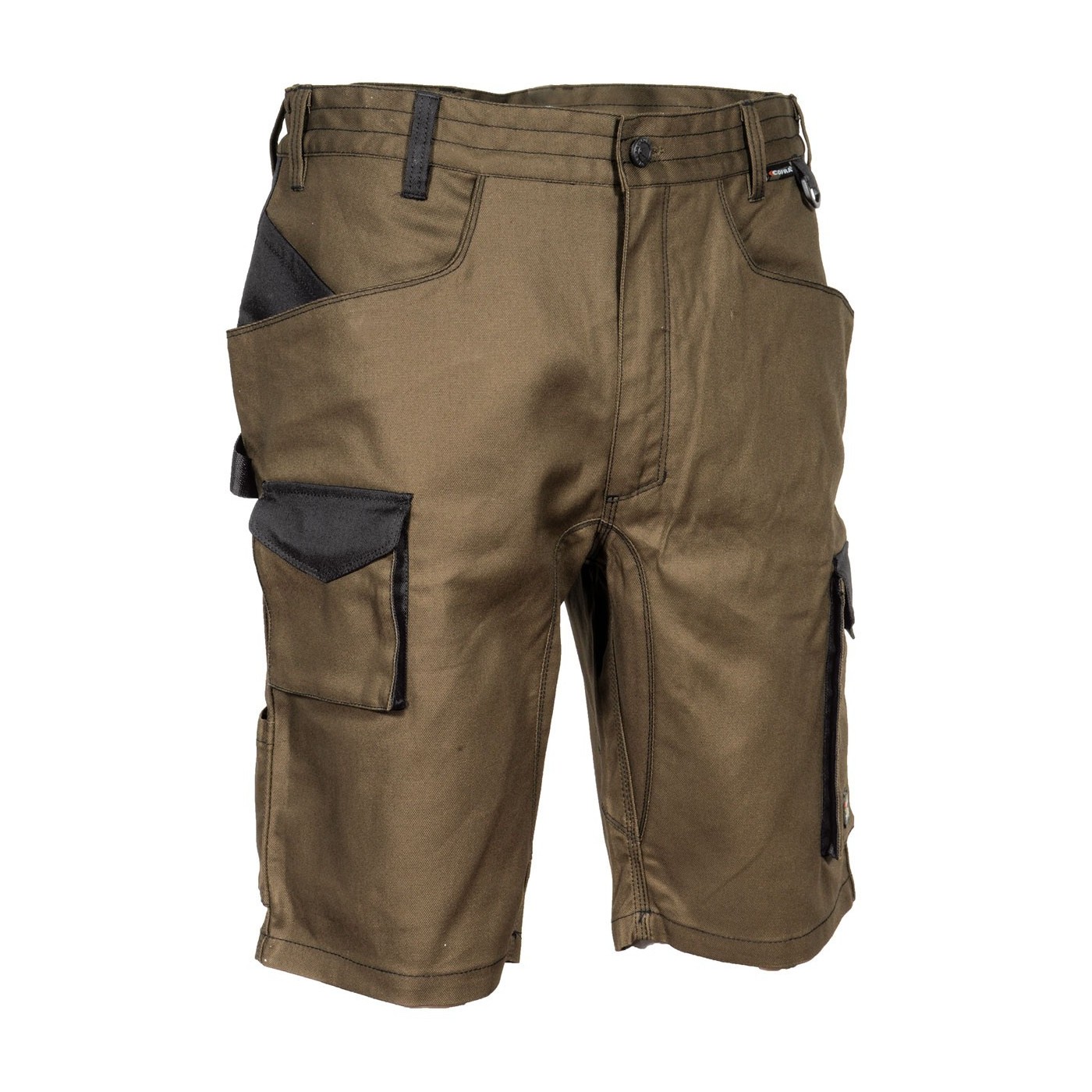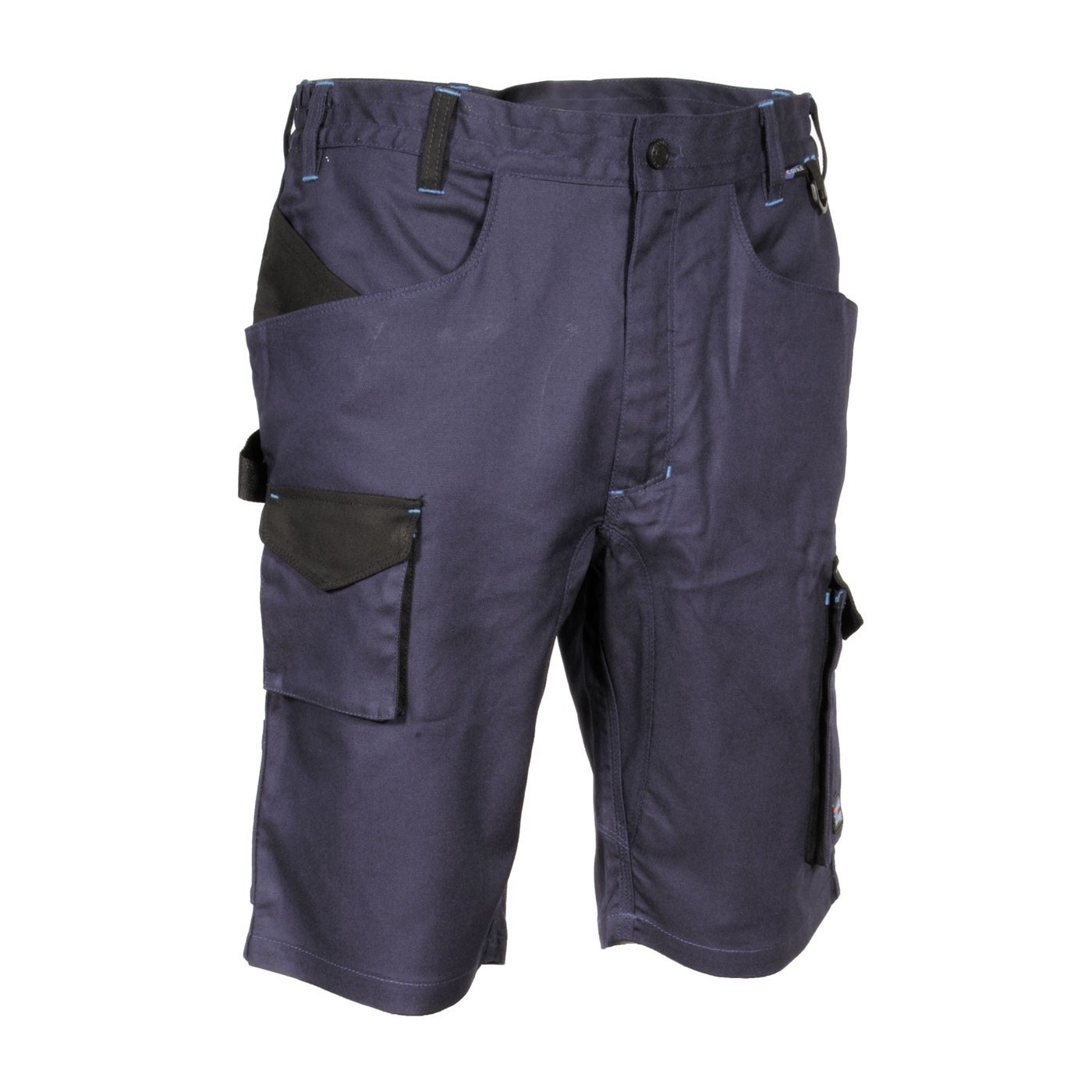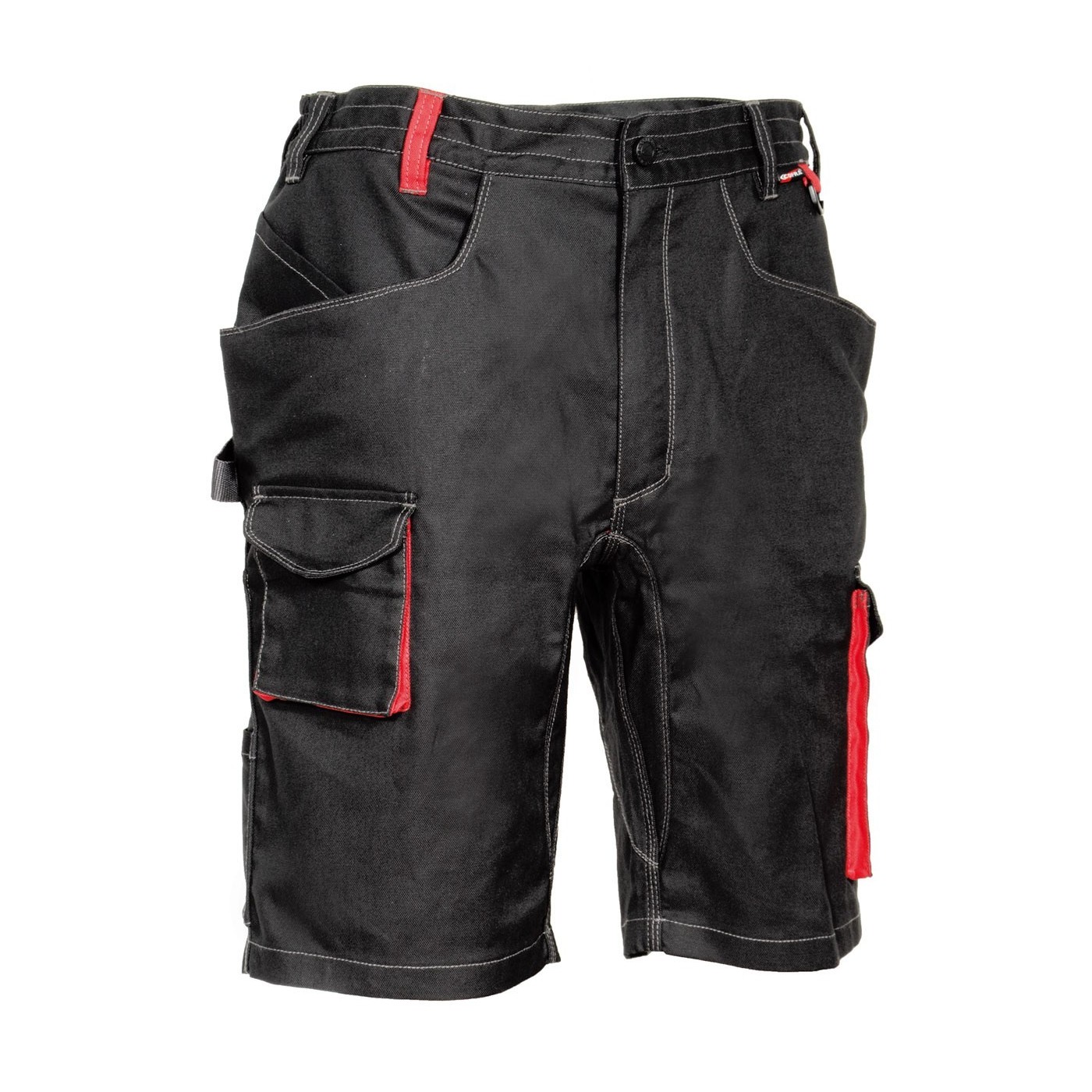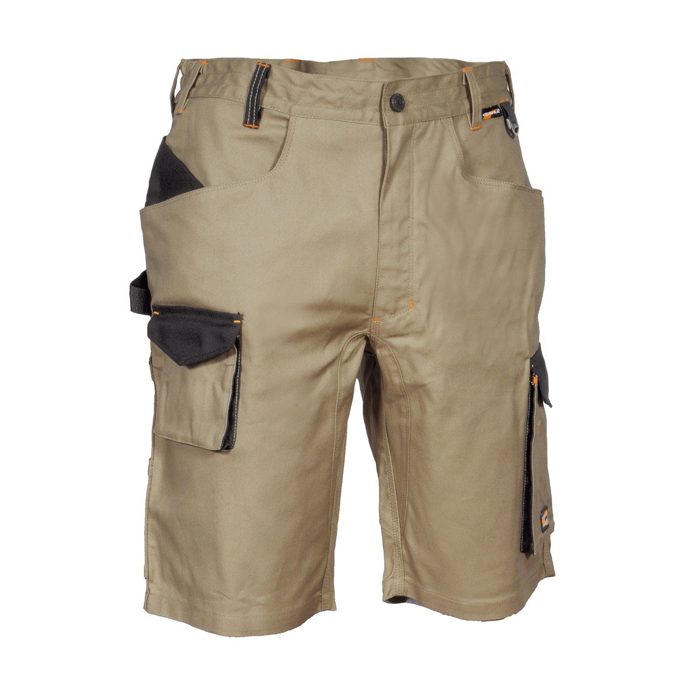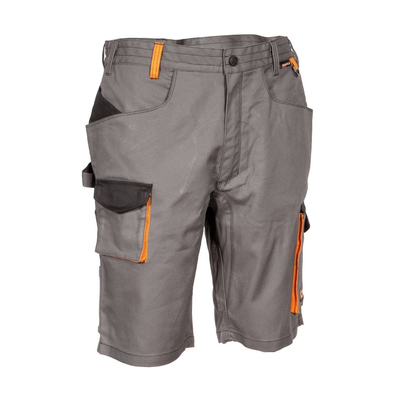 DESCRIPTION: 2 poches larges à l’avant, D-Ring, double poche à l'arrière avec velcro, élastique intérieur à la taille, entrejambe renforcé, inserts réfléchissantes 3M™ Scotchlite™ Reflective Material - 8725 Silver Fabric, passant porte-marteau, poche à outils à l'avant, poche latérale, poche pour mètre pliant, poche pour porte-monnaie, tissu élastique
