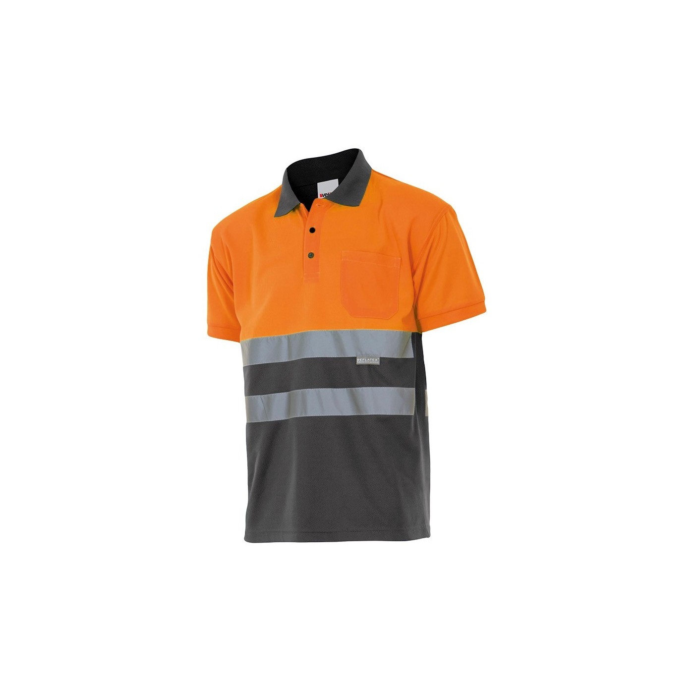 Polo à manches courtes haute visibilité bicolore en tissu respirant. Rubans réfléchissants sur le torse, col côtelé contrastant avec l'ouverture centrale avec des boutons et une poche de poitrine.