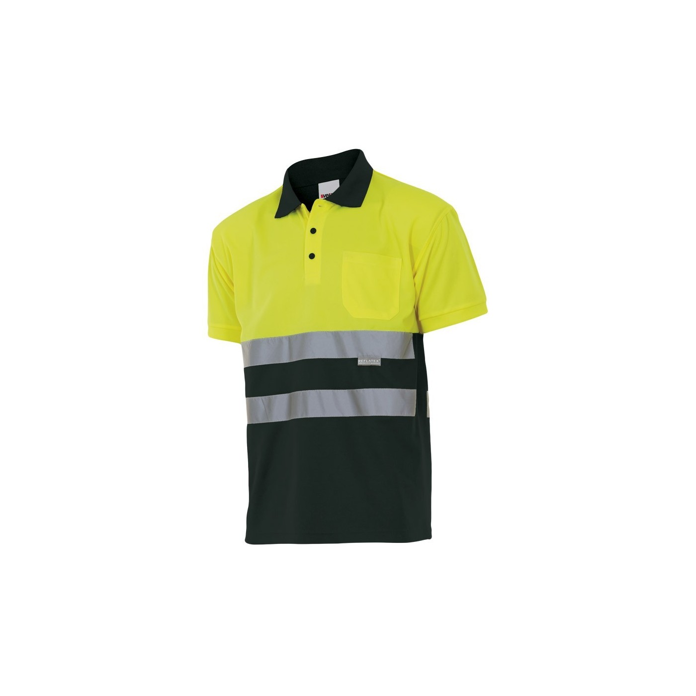 Polo à manches courtes haute visibilité bicolore en tissu respirant. Rubans réfléchissants sur le torse, col côtelé contrastant avec l'ouverture centrale avec des boutons et une poche de poitrine.