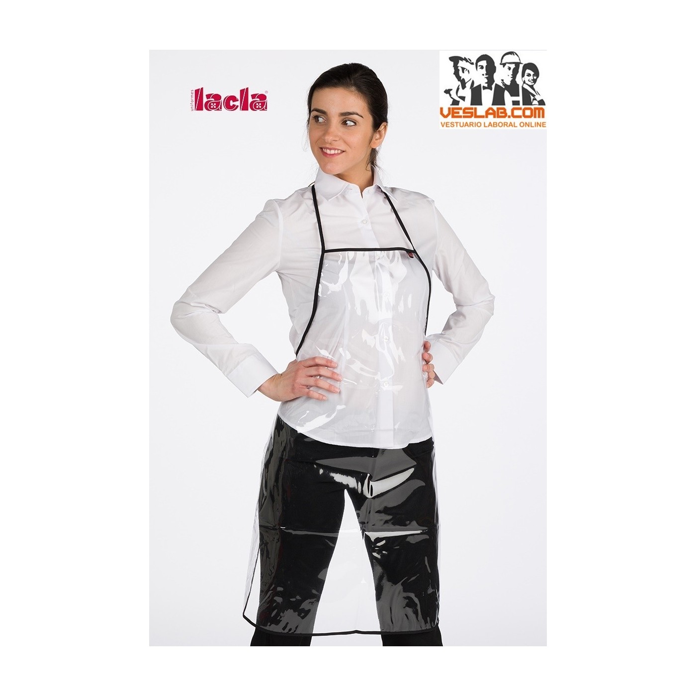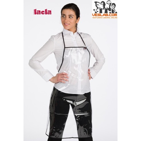 Tablier moyen transparent avec bavette enveloppante et garni de noir vif. Il convient aux rubans noués dans le dos.