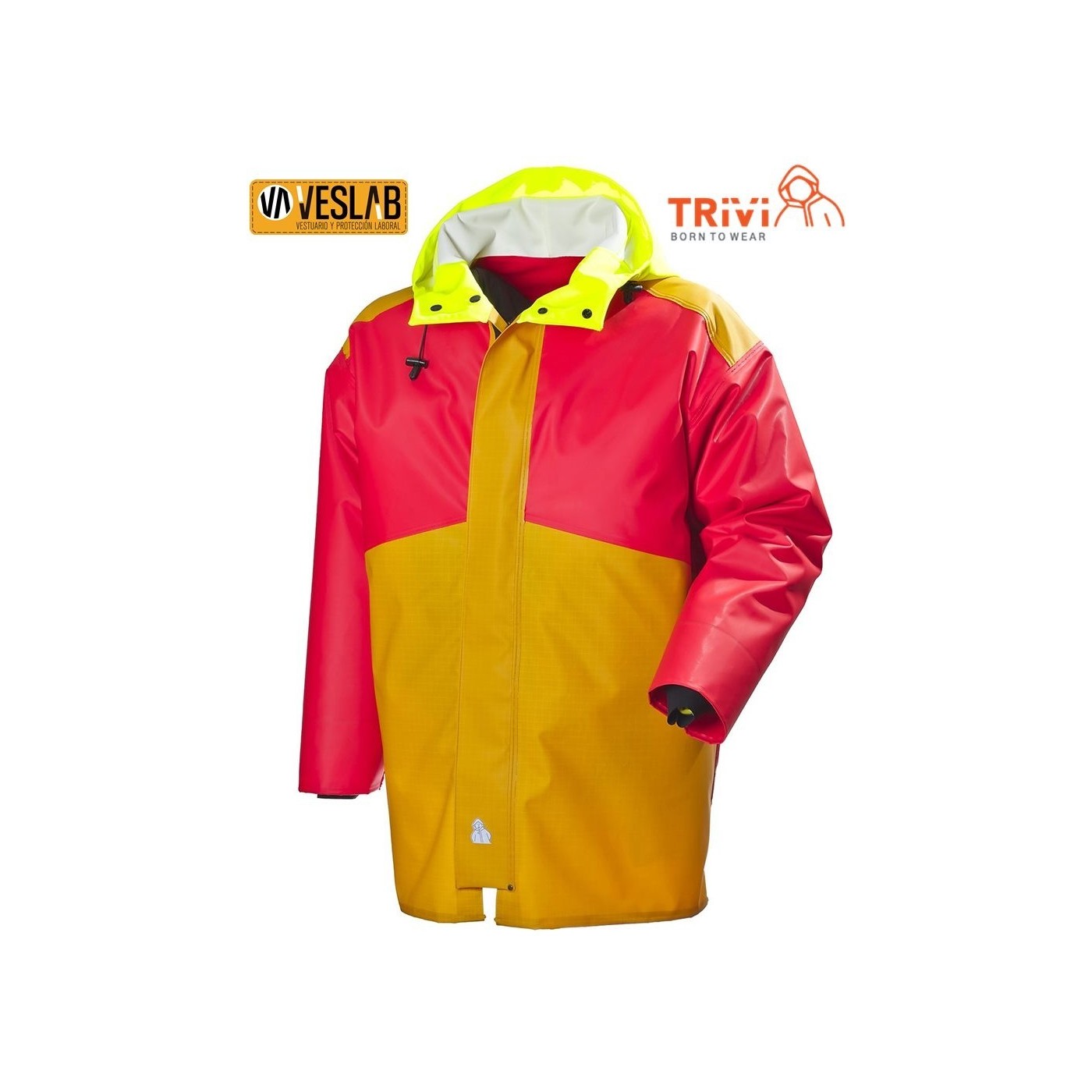 La veste de pêche bicolore RNP est fabriquée avec un tissu ripstop (sauf la capuche pour faciliter la mobilité pendant l'activité de travail) fortement recommandé pour la pêche en haute mer en raison de sa ténacité. Il possède une fermeture sur le devant par un zip PVC caché par un double rabat qui se ferme à son tour avec du ruban contact.