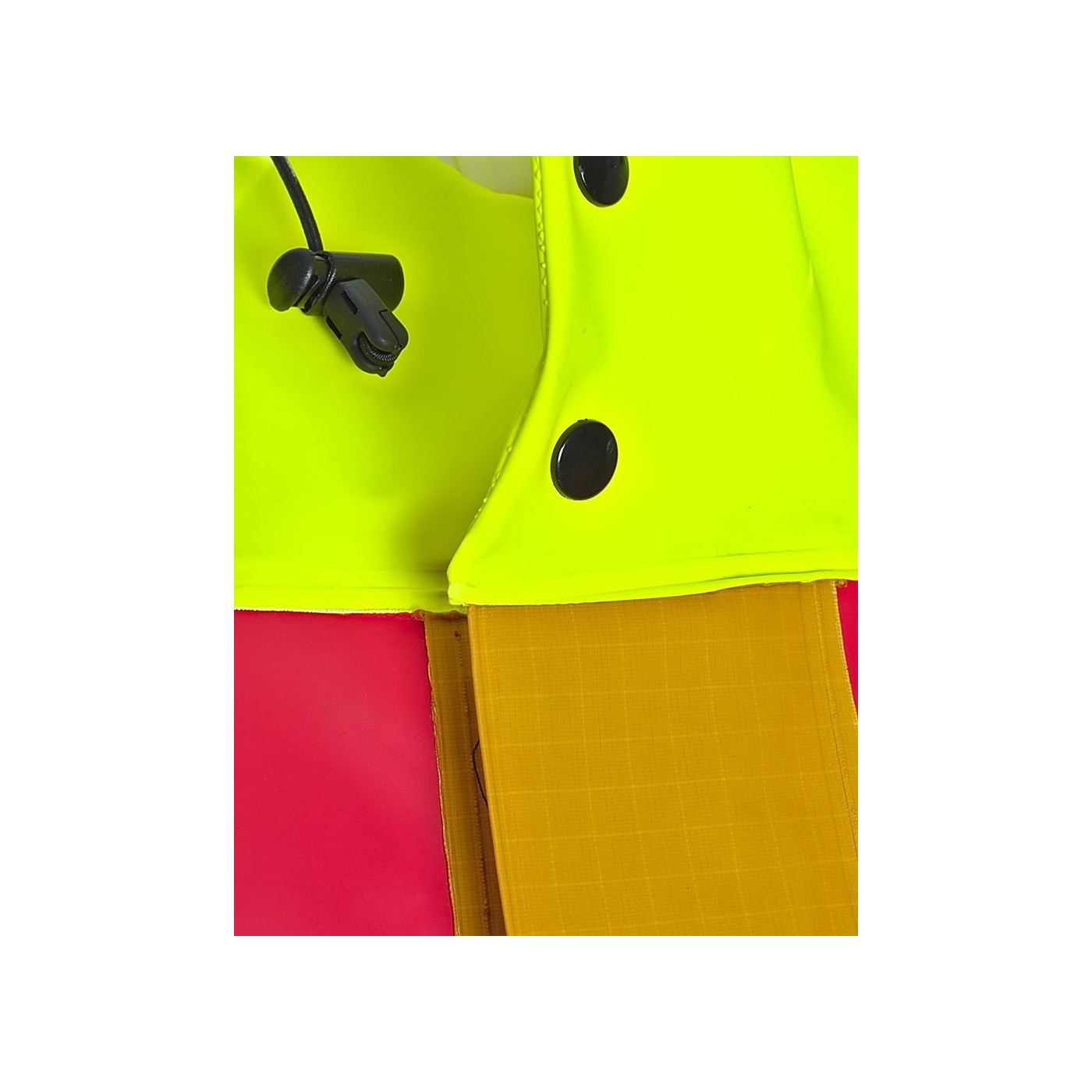 Capuche fixe, en matière G30 jaune fluor, cordon de serrage pour faciliter un ajustement plus confortable et deux boutons-pression.