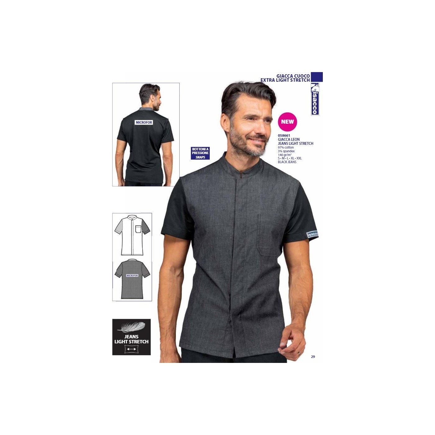 Veste de chef en manches courtes et tissu élastique Jeans Light, offrant un maximum de fraîcheur et de confort à l'utilisateur dans tous les mouvements, offrant une image jeune et actuelle.