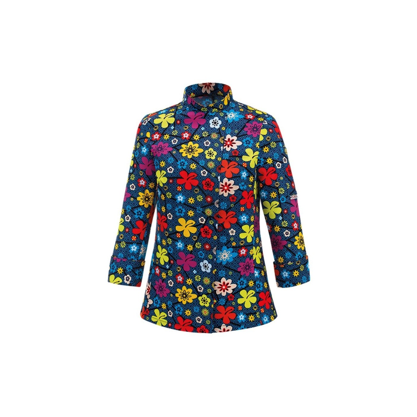 Veste de cuisine imprimée pour femme CHEAP DONNA DAISY, 100% coton, 190 gr/qm. Design Slim Fit avec manches longues, boutons-pression cachés et pratique poche sur la manche. Confort, style et fonctionnalité en une seule pièce.