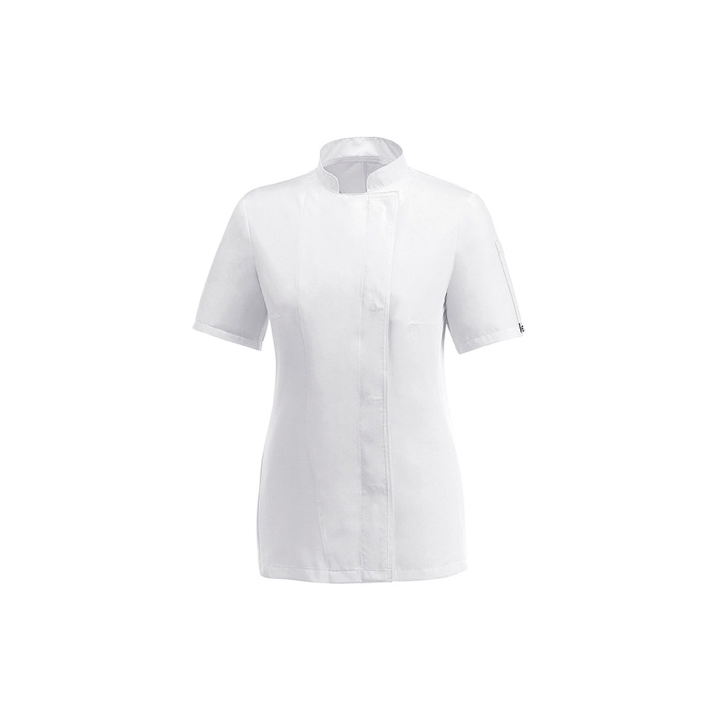 Veste de cuisinier EGOCHEF modèle 1009001E EASY GIRL en noir et blanc, conçue pour les femmes avec système Air Plus dans le dos pour la respirabilité. Réalisée en 100% microfibre, 130 grs, elle est imperméable et ne nécessite pas de repassage. Il comprend des manches courtes, un col mao et des fermetures auto-agrippantes dissimulées.