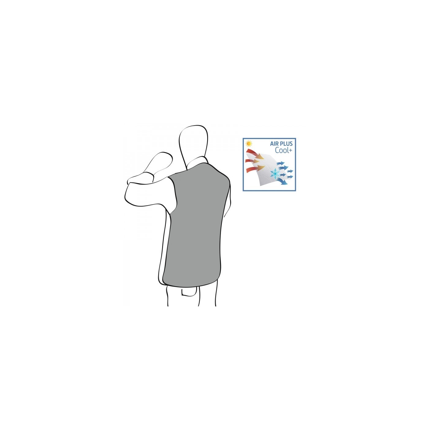 Veste unisexe . Manches courtes . 100 % microfibre ( 130 gr . / M2 ) . Blanc. 10 boutons noirs . Cool + à l'arrière.