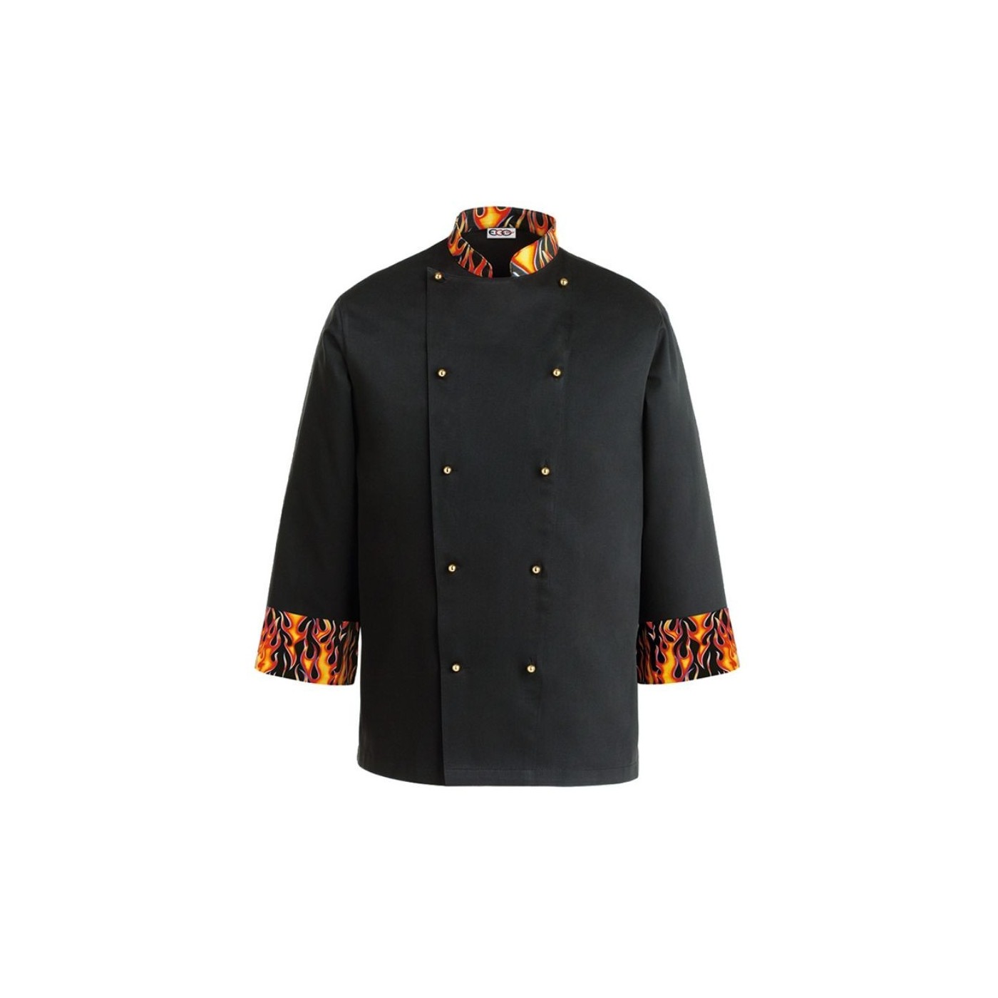 La Veste de Cuisine Fantasy Flames Egochef est unisexe, de couleur noire, fabriquée en 65% polyester et 35% coton. Elle dispose de manches longues, de 12 boutons interchangeables, d'un bouton Gold et d'un col et poignets au design Flames, offrant style et confort pour les chefs les plus exigeants.