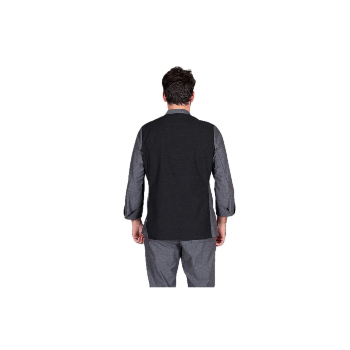 La veste de cuisine unisexe SILVA de Gary’s offre une coupe semi-ajustée, une respirabilité grâce à AEROSILVER dans le dos et un tissu CHAMBRAY à motif losange en gris anthracite. Avec des boutons-pression cachés, des poignets retournés et une poche sur la manche, elle allie confort, résistance et style professionnel.