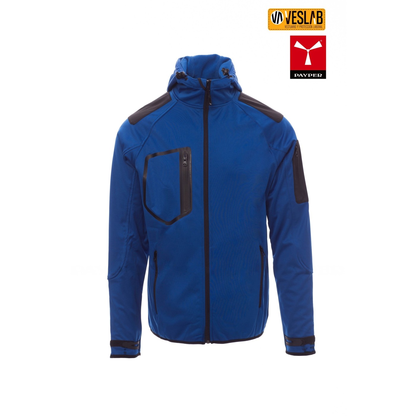 Veste ergonomique en tissu technique Soft-Shell pour homme, manches raglan et capuche profilée avec deux coutures et cordon de serrage.