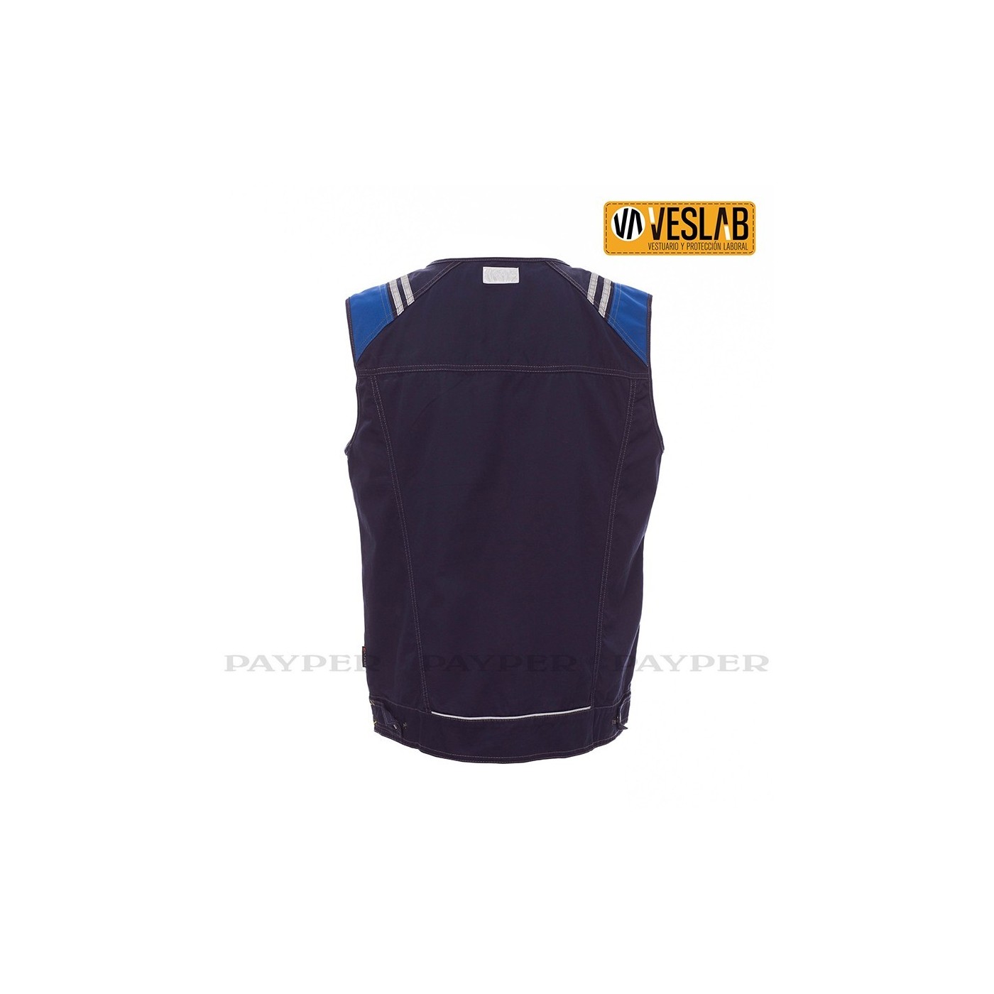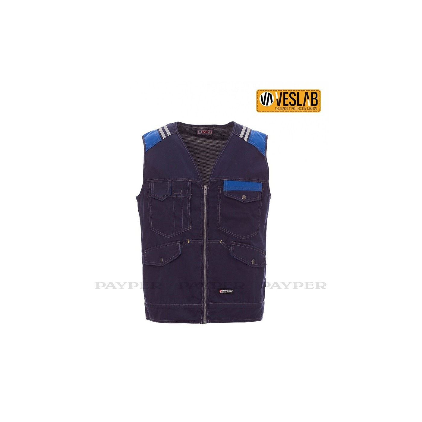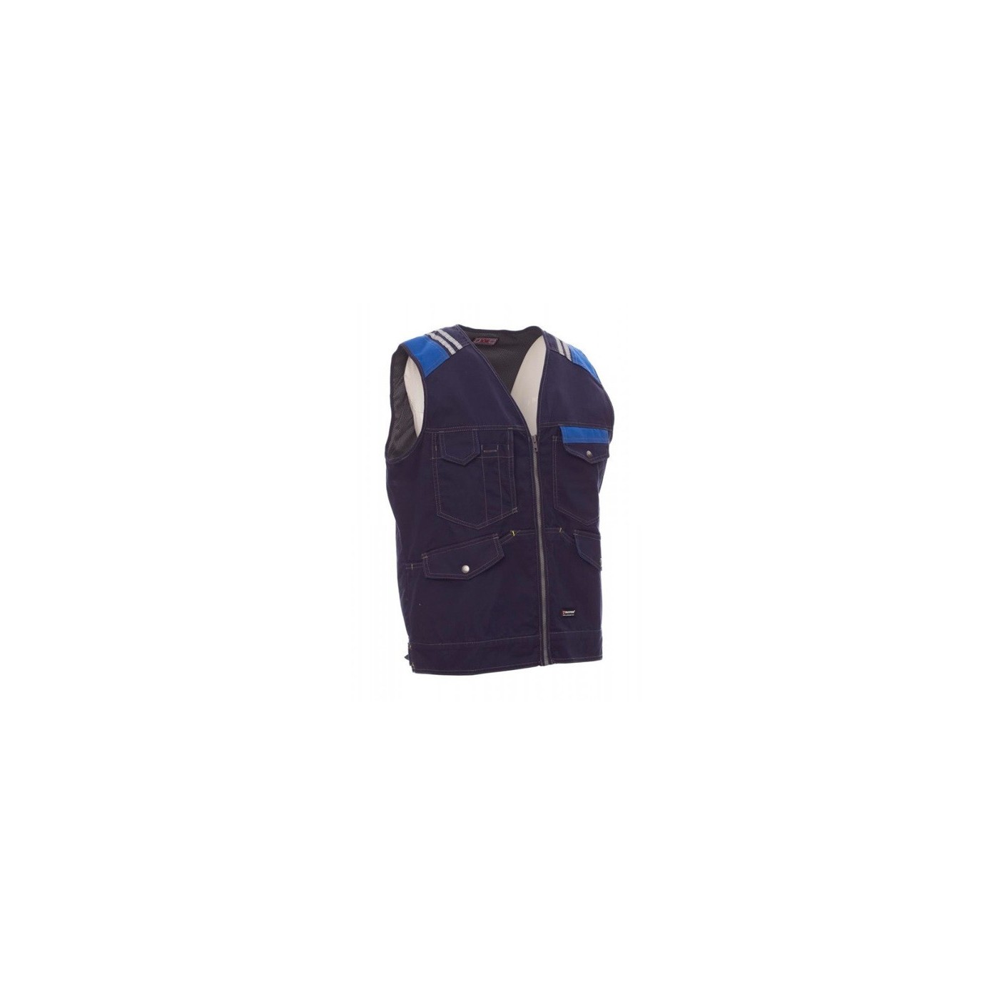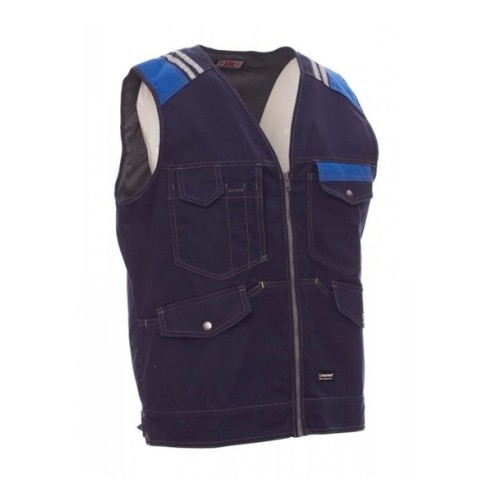 Gilet de travail bicolore multi-poches pour homme. Il a une fermeture avant avec une fermeture éclair en plastique, une fermeture à bouton à la taille, trois poches frontales LOCK SYSTEM, deux comme poches kangourou avec rabats et bouton en métal.