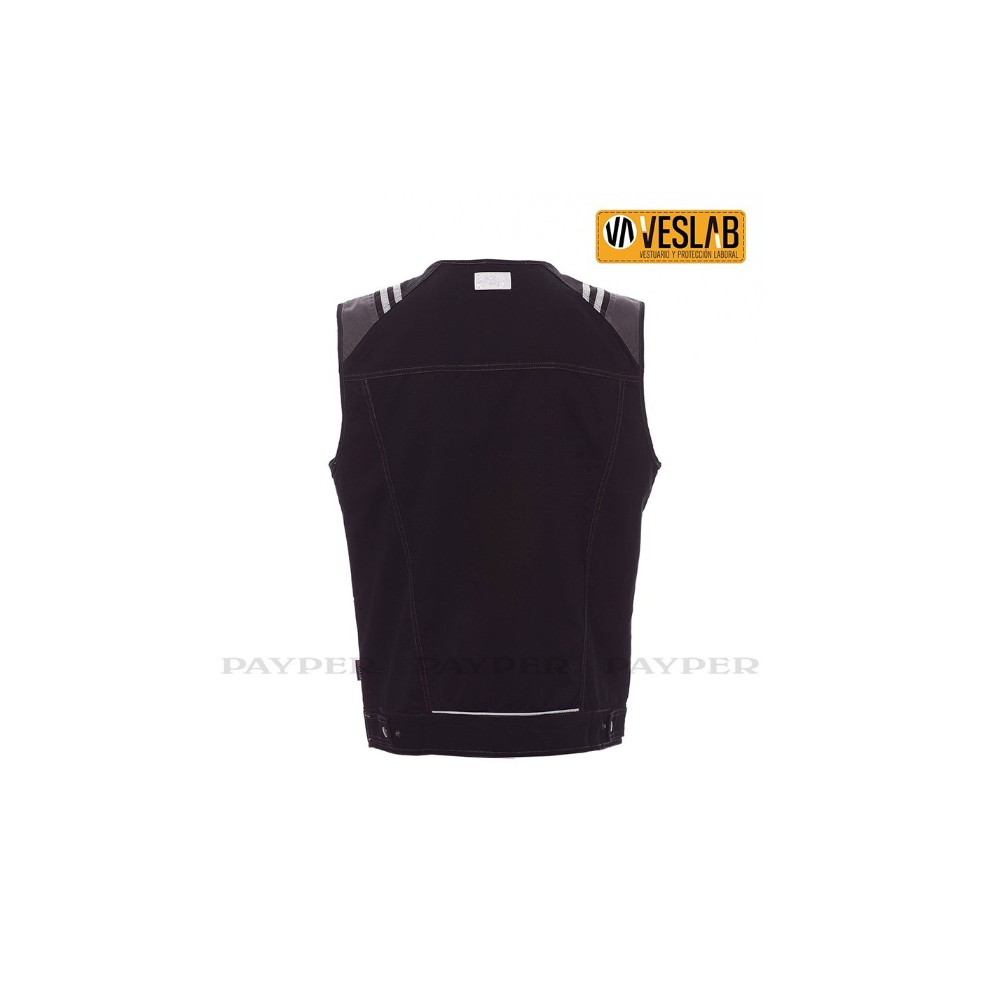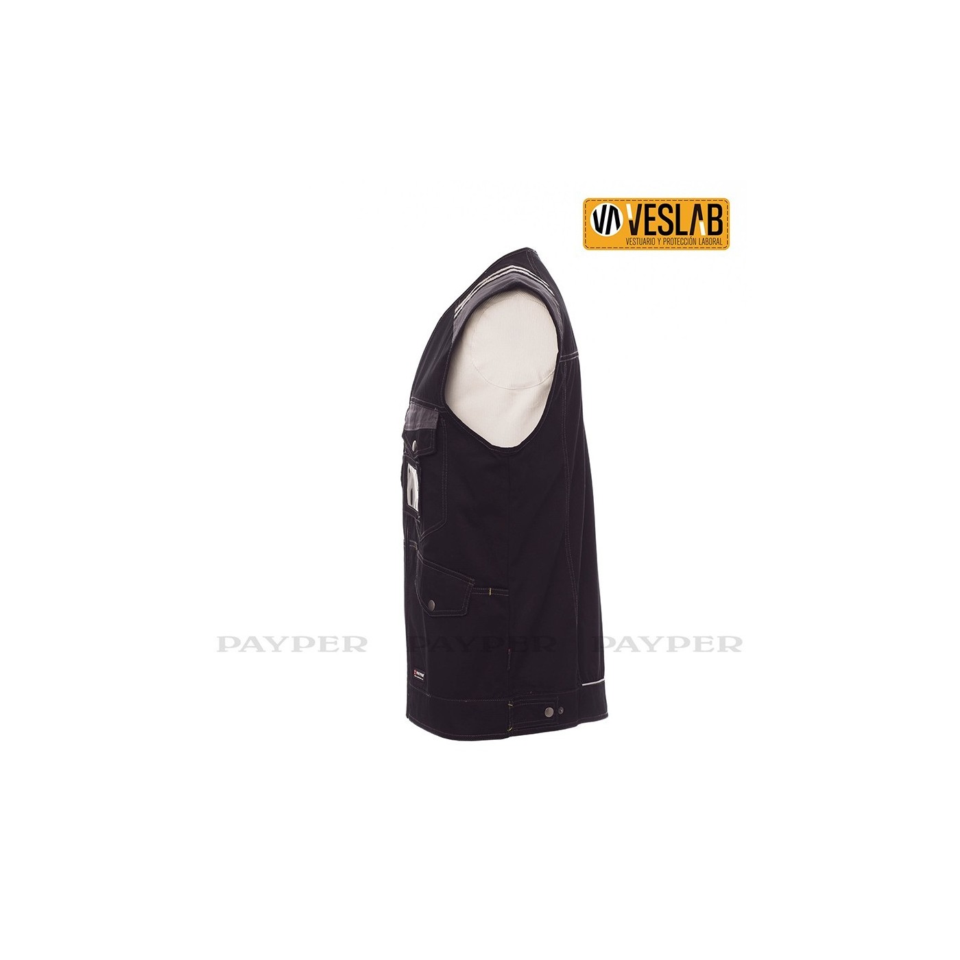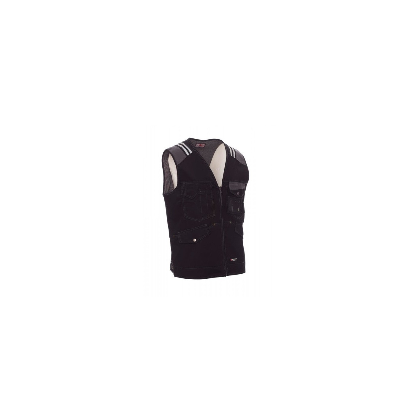 Gilet de travail bicolore multi-poches pour homme. Il a une fermeture avant avec une fermeture éclair en plastique, une fermeture à bouton à la taille, trois poches frontales LOCK SYSTEM, deux comme poches kangourou avec rabats et bouton en métal.