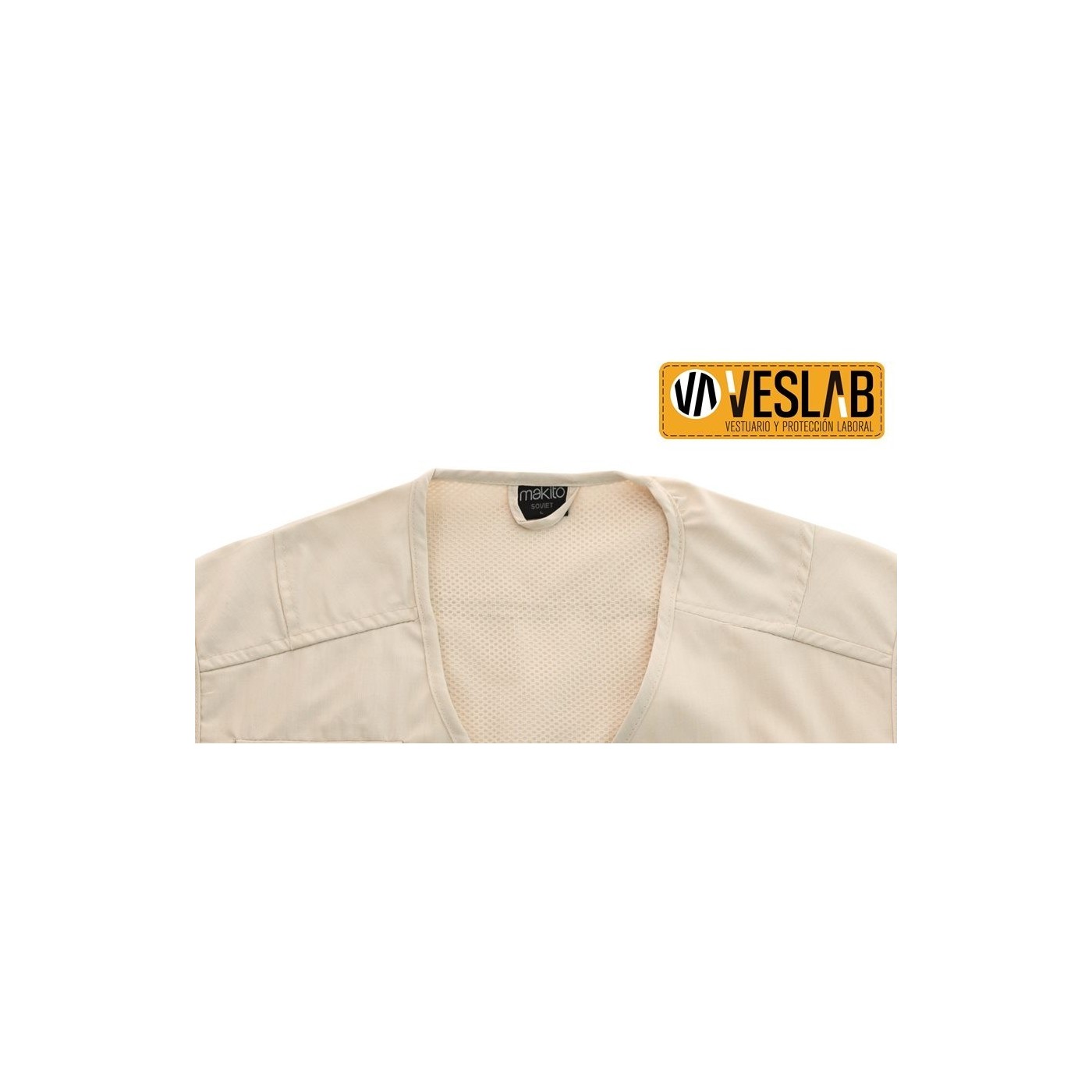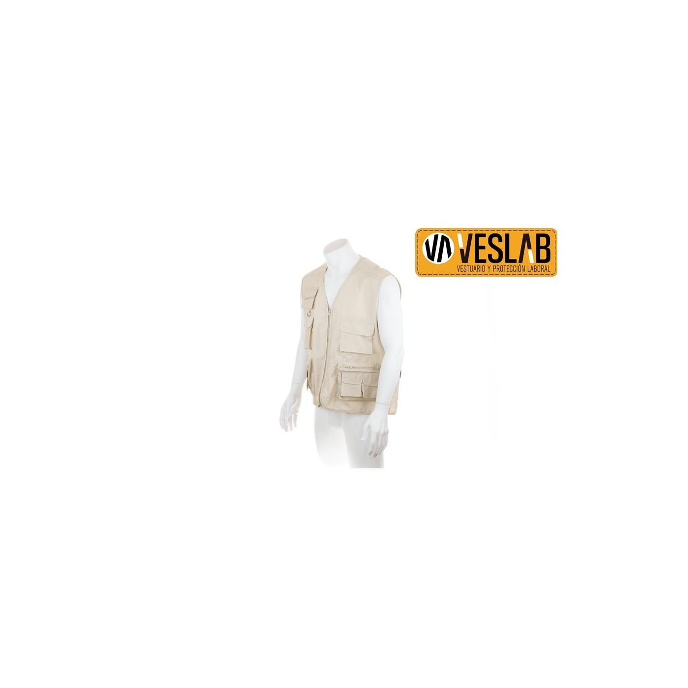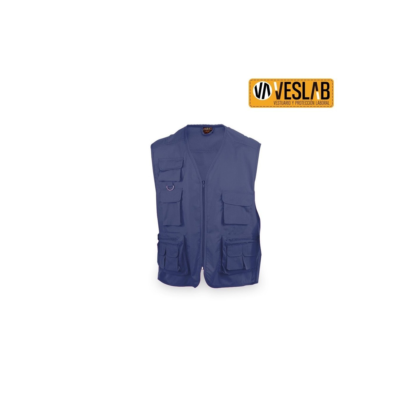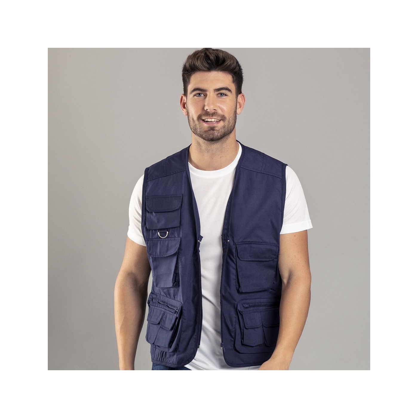 Multi-pocket work vest in a resistant combination of brightly colored cotton and polyester materials.