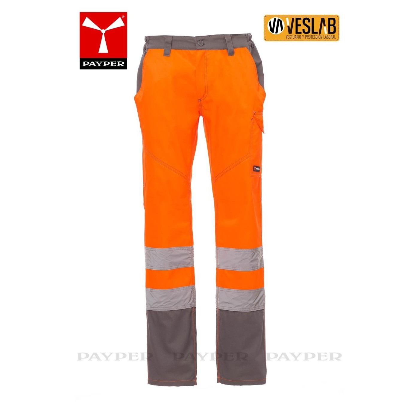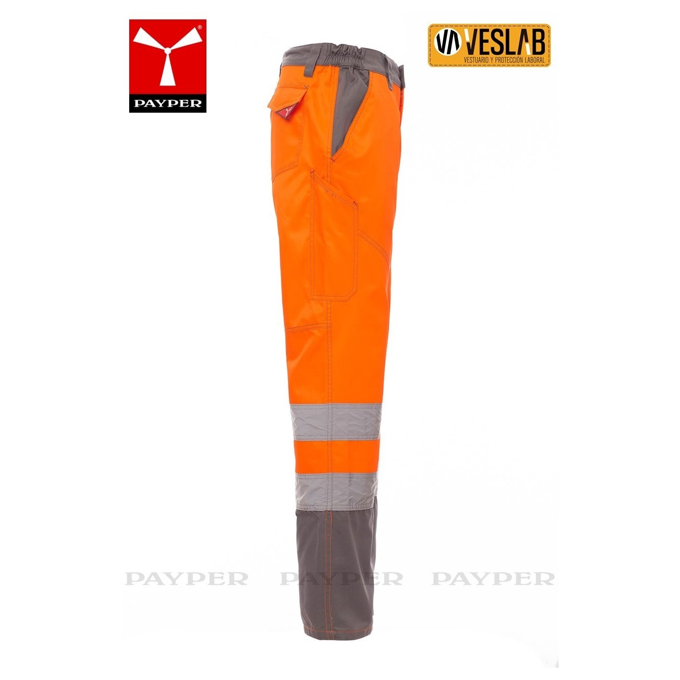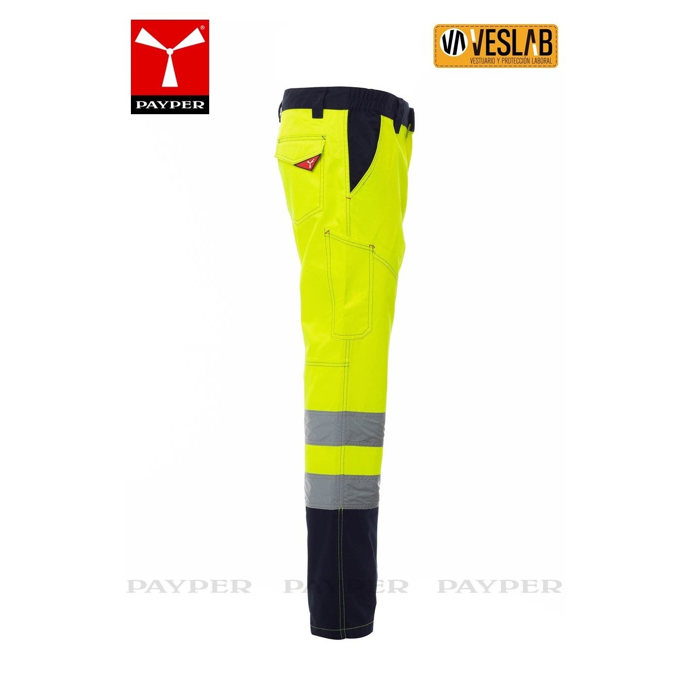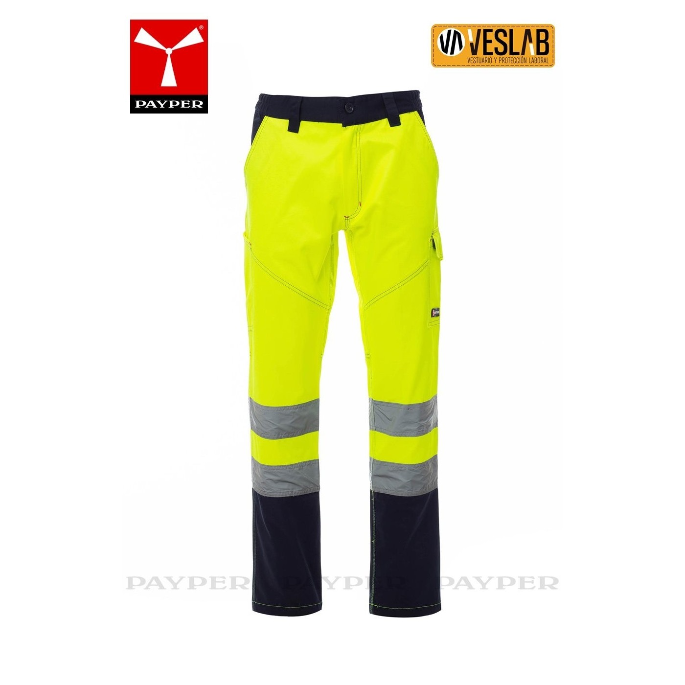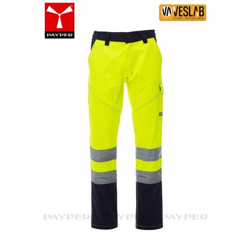 Pantalon bicolore haute visibilité pour l'hiver avec bandes réfléchissantes, côtés élastiques et passants de ceinture à la taille.