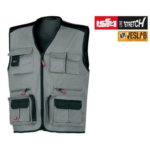 Gilet de travail léger multi-poches avec tissu élastique et intérieur en mesh. Il dispose d'une poche pour téléphone portable en tissu e-care (absorbant et protégeant des ondes électromagnétiques du mobile).