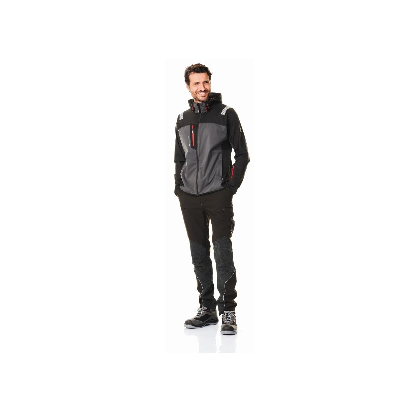 C'est une veste en tissu softshell dernière génération légère et très confortable. Il est idéal pour un travail intense ou une utilisation sportive, même pendant les mois pas trop froids. Le vêtement dispose de 4 poches, d'une capuche et d'inserts réfléchissants sur les épaules pour améliorer la visibilité du porteur dans des conditions de visibilité extrêmes.