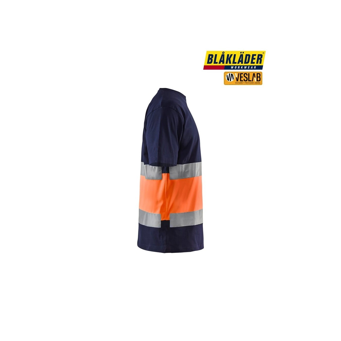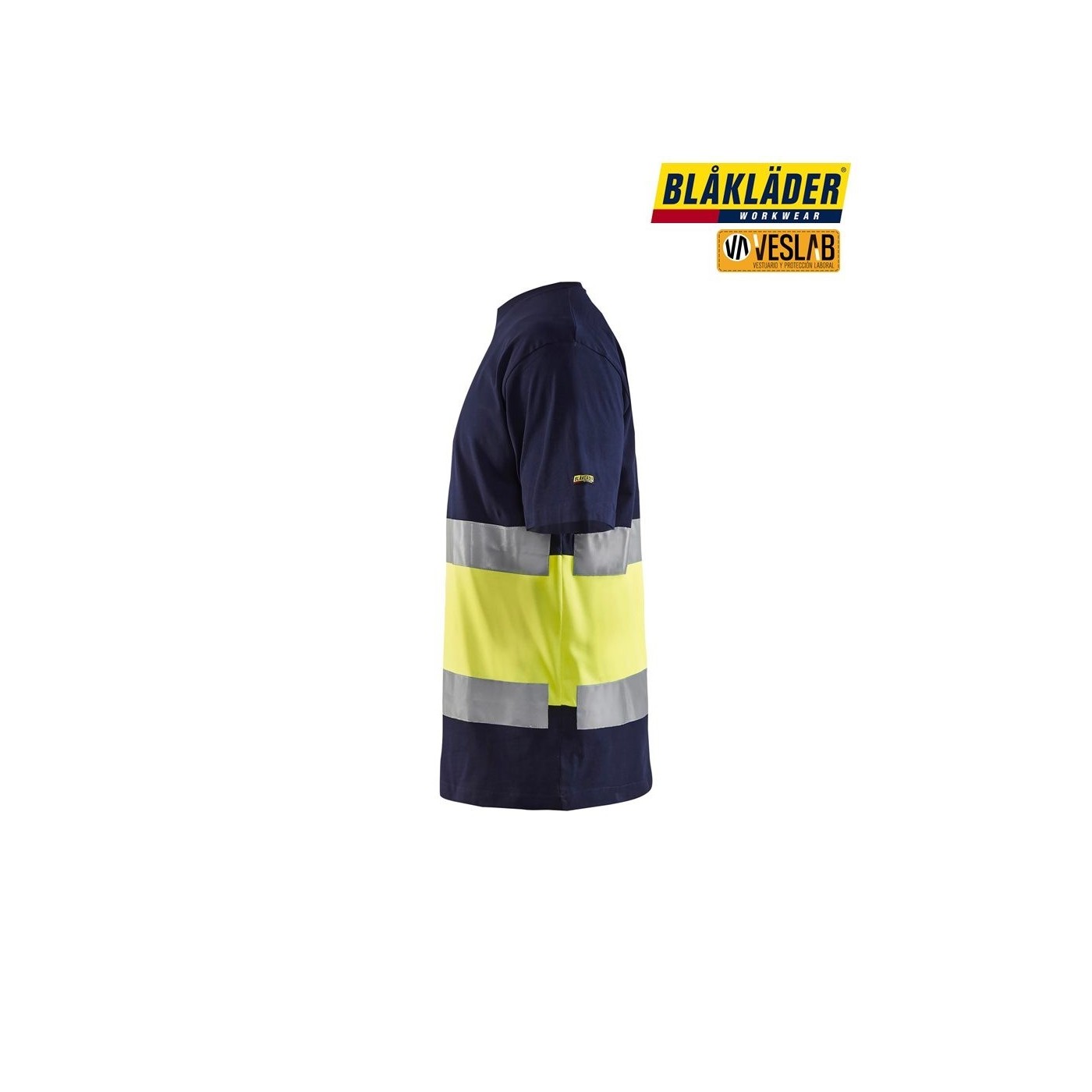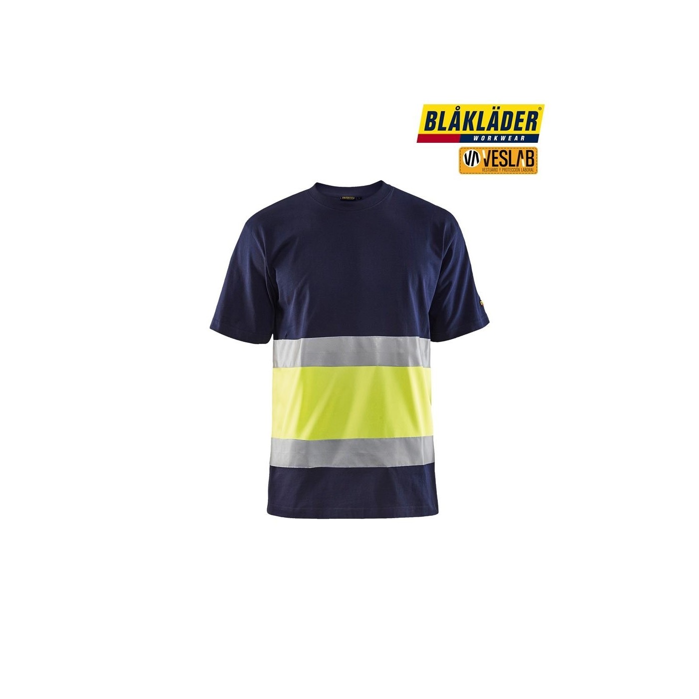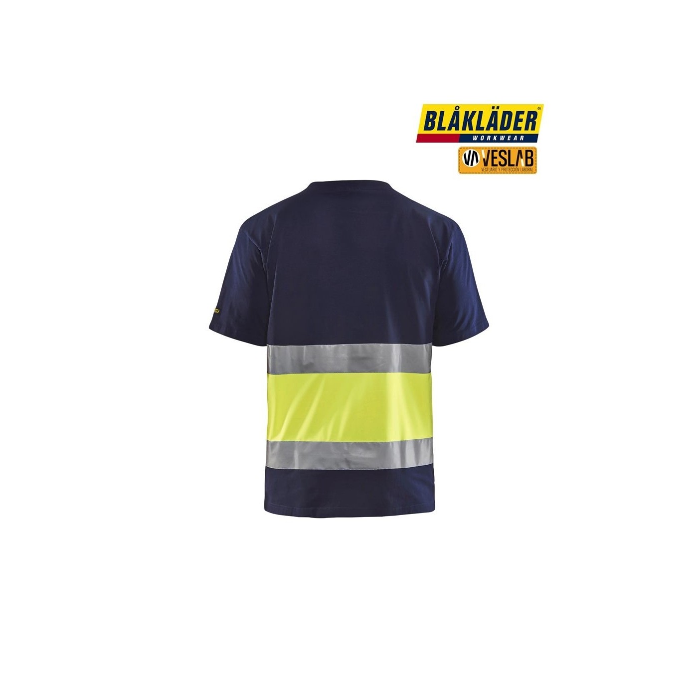 Le col est rond avec des coutures renforcées. Il a des propriétés d'étirement pour permettre une plus grande aisance de mouvement. La zone sombre de la chemise est 100% coton et la zone haute visibilité 100% polyester. Les coutures sont stratégiquement placées pour un meilleur confort sous la manche. La chemise a des bandes réfléchissantes cousues qui n'atteignent pas la couture latérale, pour plus de confort et de liberté de mouvement.