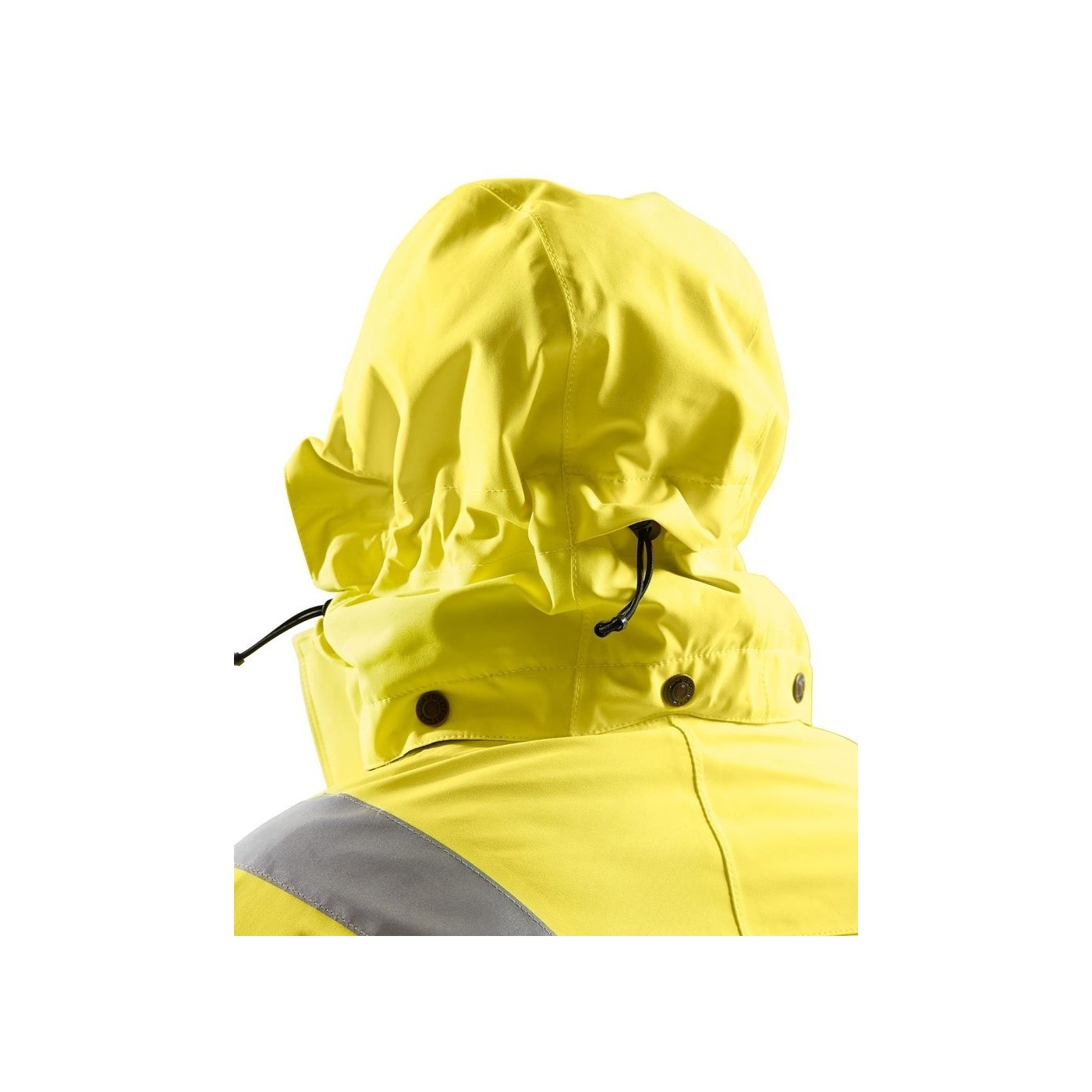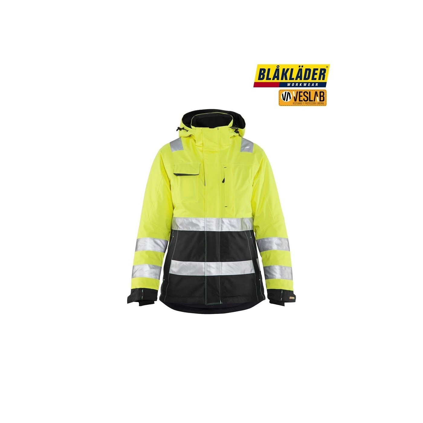 Veste d'hiver haute visibilité pour femme avec tissu extensible extérieur extrêmement durable, coupe-vent, imperméable et résistant à la saleté. Le vêtement a des coutures scellées et des détails de couleur plus foncée dans les zones les plus exposées à la saleté.