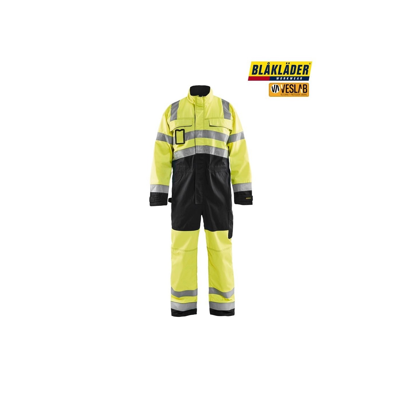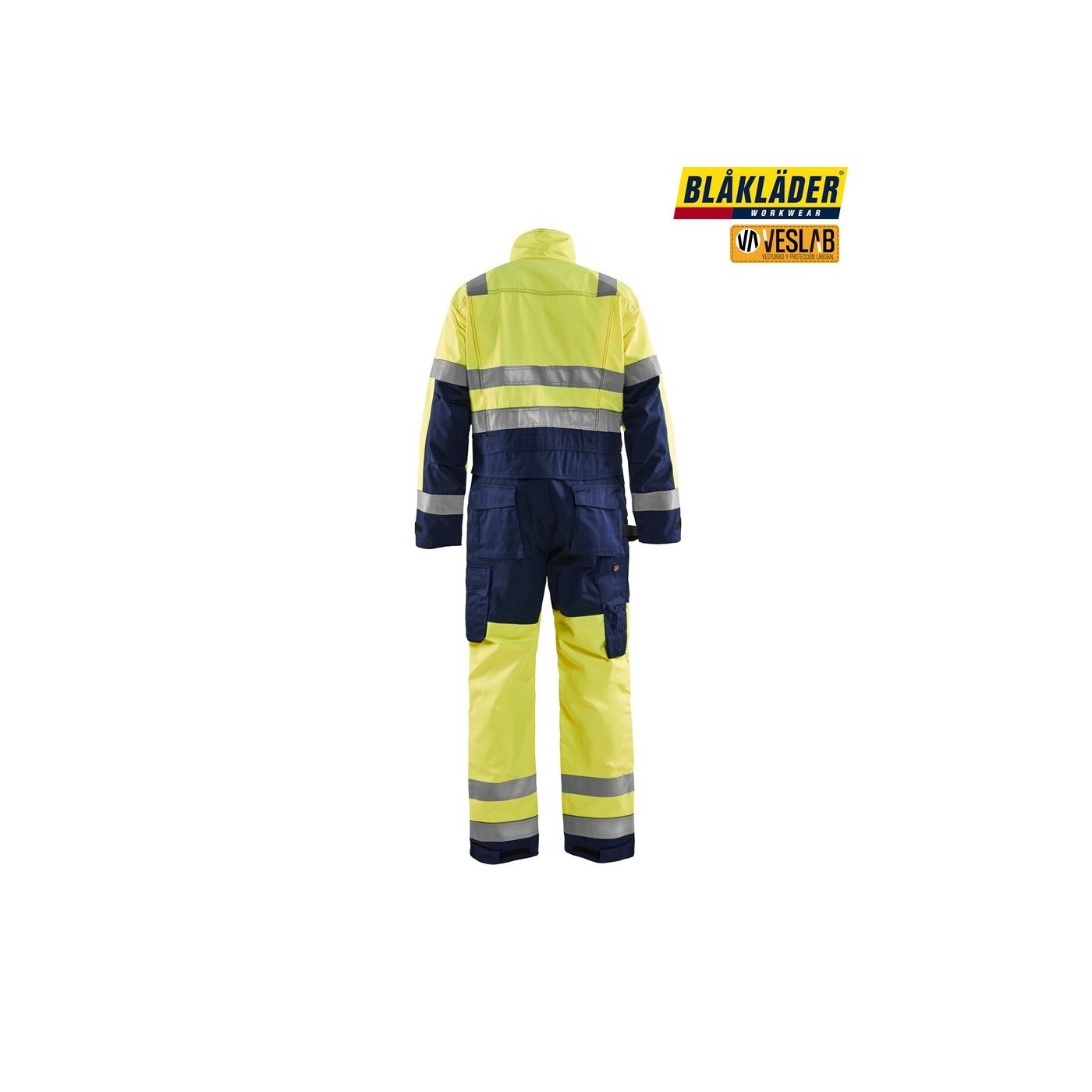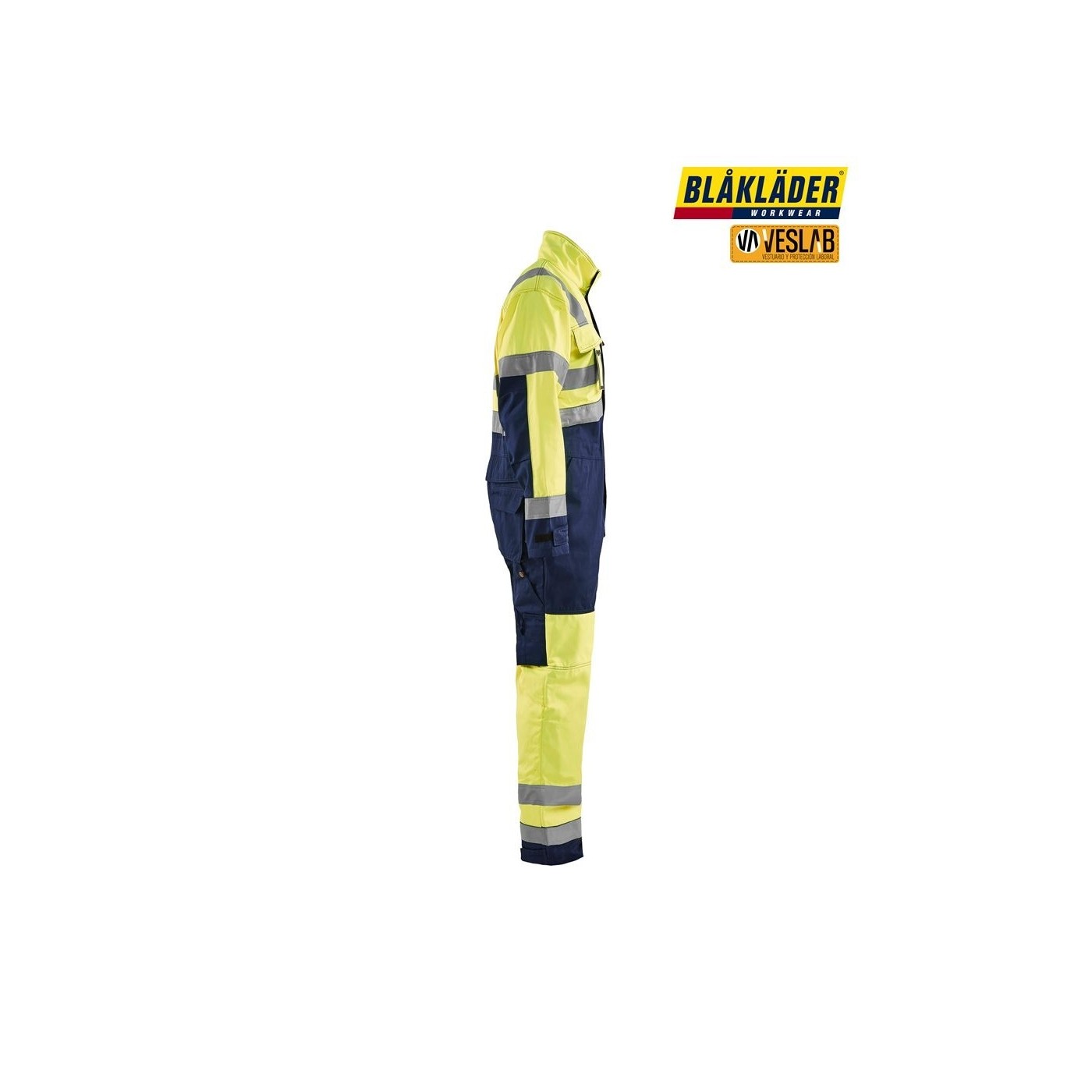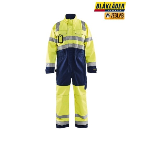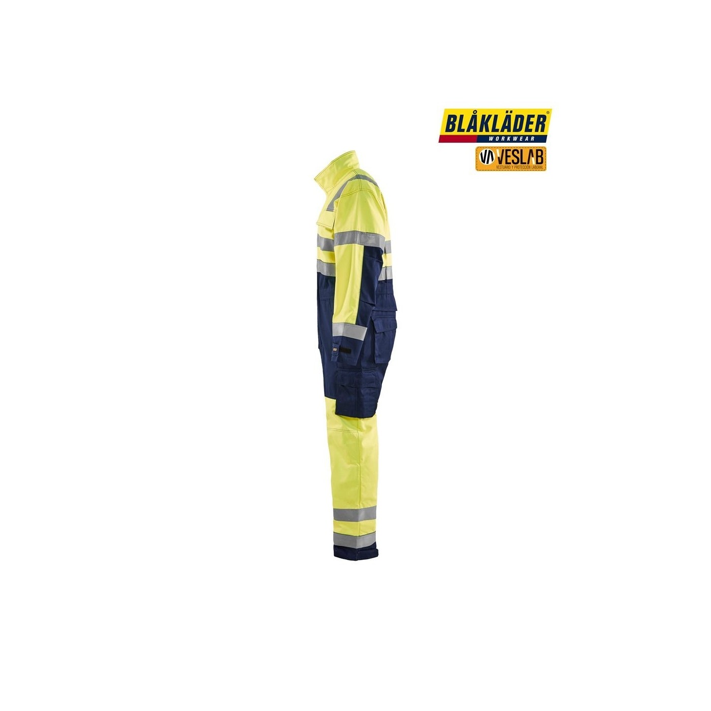 Combinaison de travail haute visibilité avec poches poitrine à rabats et velcro. Poches latérales ouvertes, dont une avec anneau en D. Poches à soufflet sur les jambes et à l'arrière avec rabats. Porte-marteau. Poche mètre pliant avec poche stylo et porte-couteau. Longueur de manche réglable avec velcro. Poche intérieure pour téléphone. Poches intérieures aux genoux. Bande réfléchissante de 50 mm. Poche d'identité.