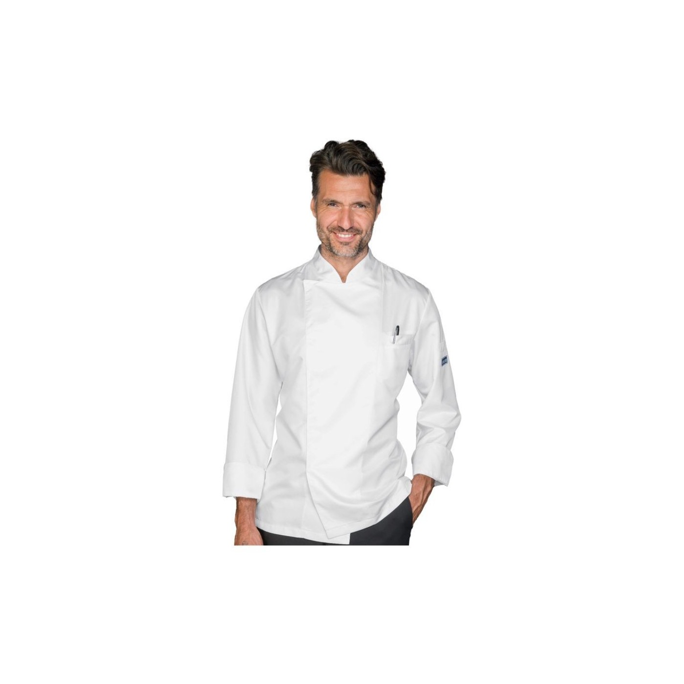 Veste de cuisine Isacco Sincler. Mixte, coloris blanc, 100% Polyester Super Dry 130 gr/qm, manches longues, poche manche, boutons pression cachés et côtés microfor pour une ventilation optimale. Élégance et confort pour les chefs modernes !