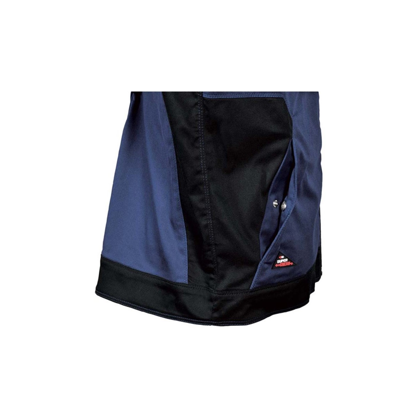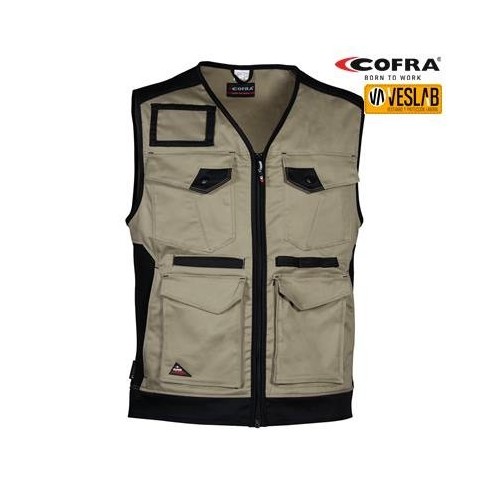 Gilet multipoches industrielle en tissu élastique. Il a 2 poches, un portable sur la poitrine avec du tissu E-WARD. Il intègre un anneau porte-cartes avec bouton pression, une poche poitrine avec un rabat fermé par un fermoir et un rabat protège-menton.