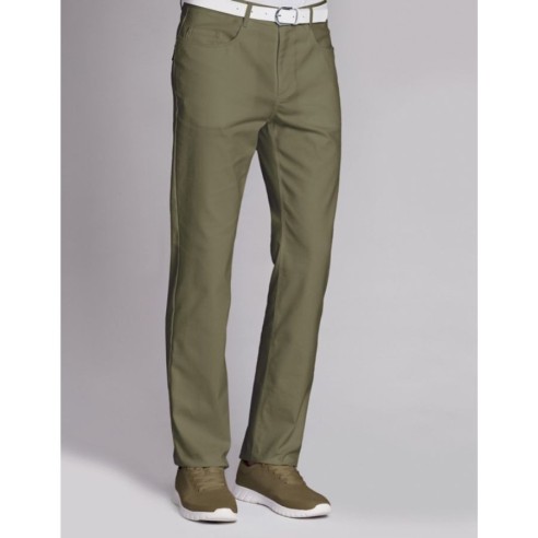 Pantalon de travail en denim à 5 poches, conçu pour les hommes dans un ton olive. Le tissu est composé de 57 % de coton, 39 % de polyester et 4 % de lycra, avec un poids de 290 grammes par mètre carré. Il comporte 2 poches latérales et 2 poches arrière, ainsi que des passants de ceinture et des rivets pour plus de durabilité. De plus, il intègre la technologie Stretch pour apporter confort et flexibilité dans les mouvements.