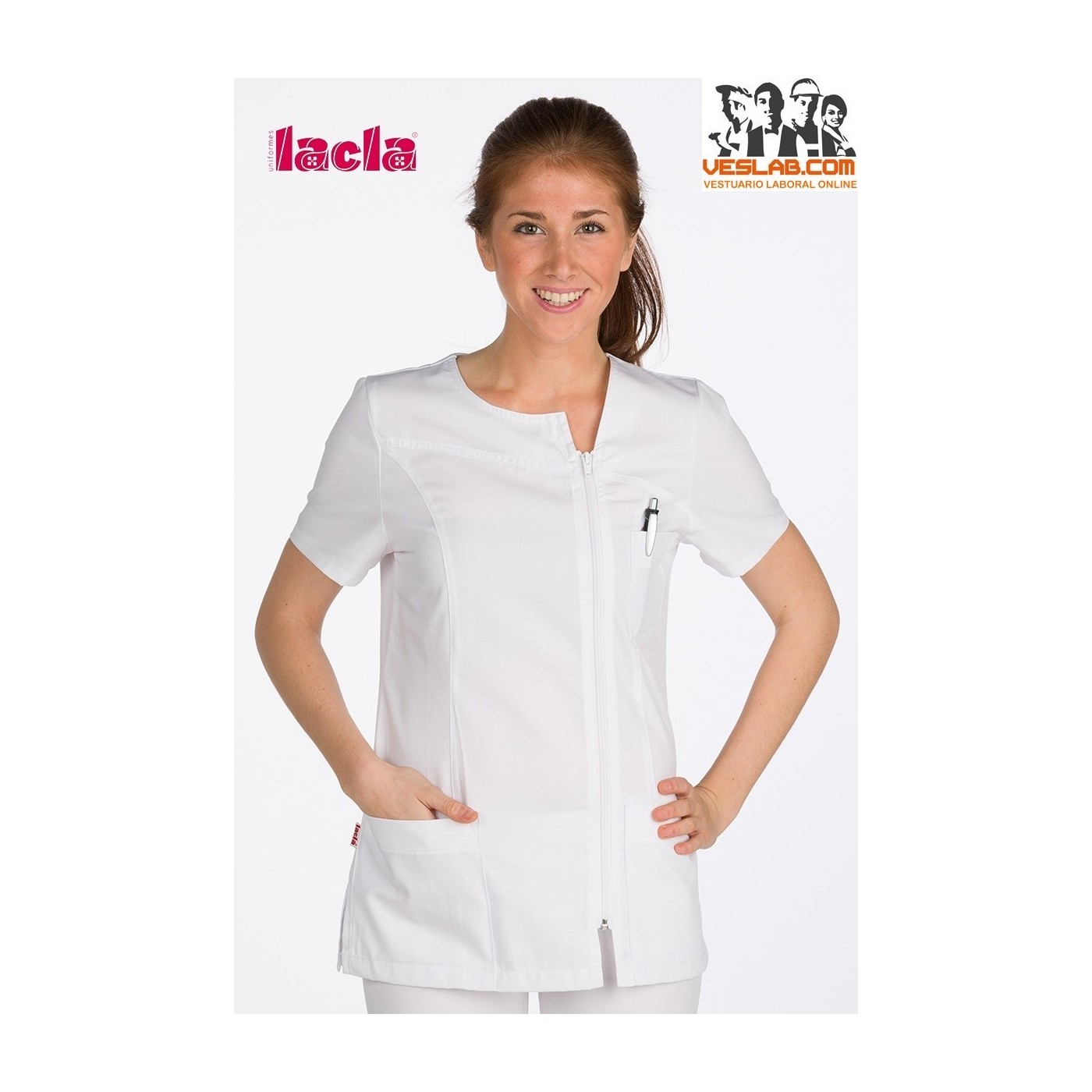 Veste lisse, avec encolure ronde et empiècement irrégulier, devant avec lisière, poche supérieure et inférieure, zip latéral, dos avec pinces, ouvertures latérales, manches courtes.