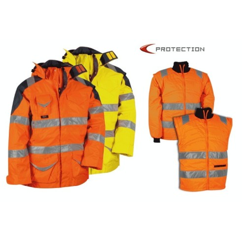 veste extérieure: bandes et inserts réfléchissants 3M Poche pour téléphone mobile en tissu isolant aux ondes électromagnétiques E-CARE et passant pour écouteur Coutures soudées et étanchées thermocollées 4 poches spacieuses à l'avant Poches poitrine Poche intérieure avec zip Capuche ajustable et détachable Pièces de renfort aux coudes Poignets ajustable Double rabat intérieur Veste intérieure: manches amovibles avec zip Bandes et inserts réfléchissants 3M Poche avec zip imperméable Poignets et col élastiques Vêtement approuvé conformément à la norme EN 342 assortit avec le pantalon SAFE |