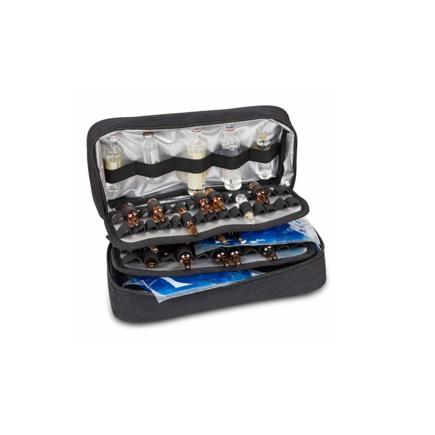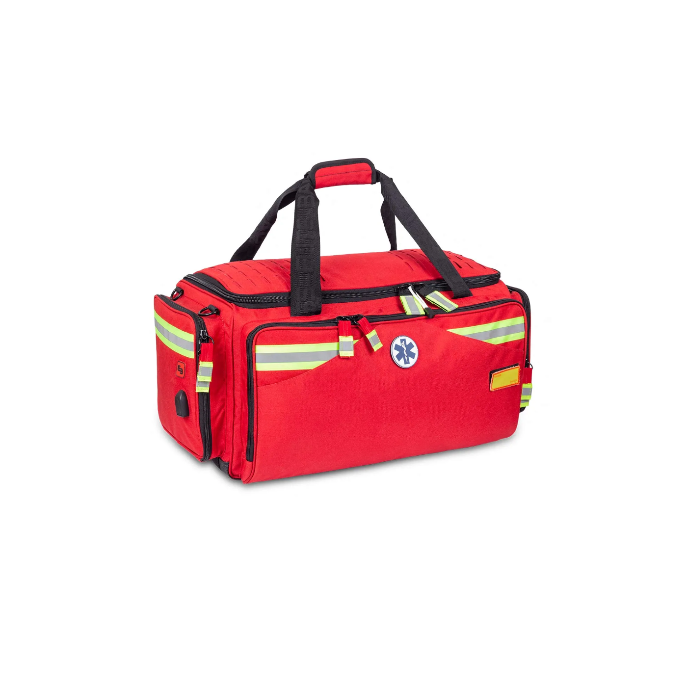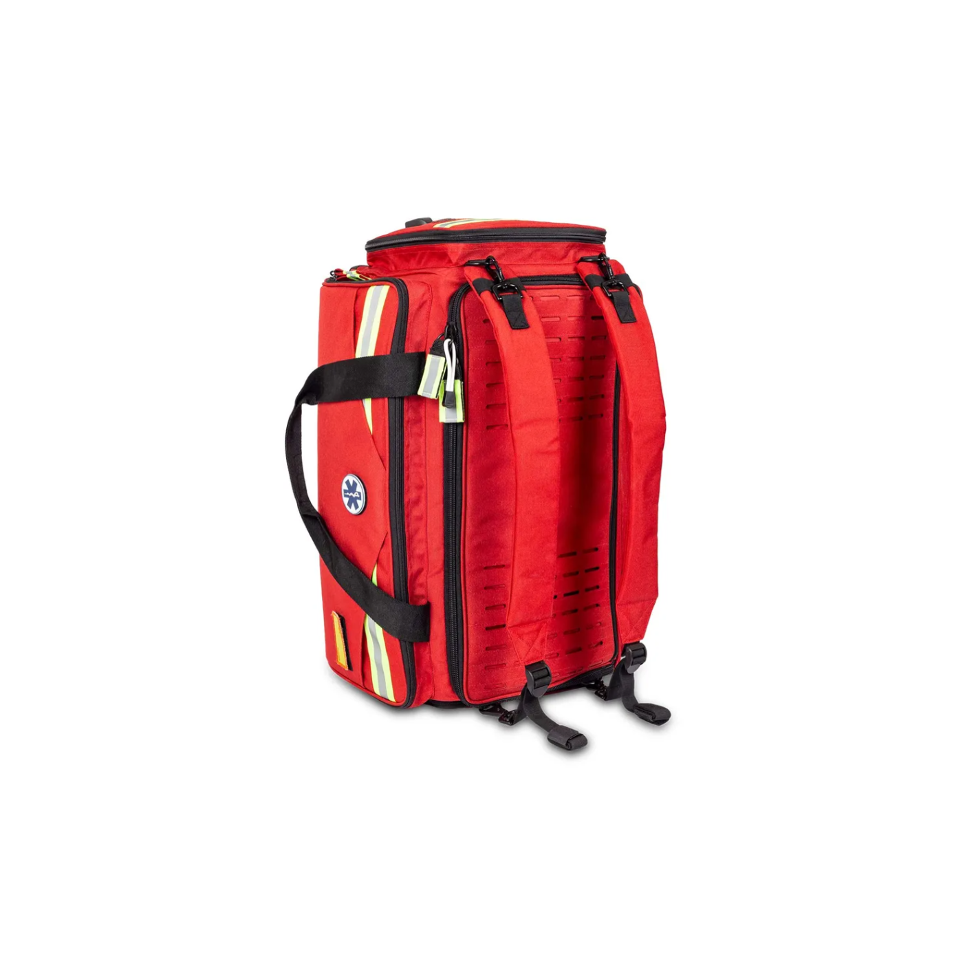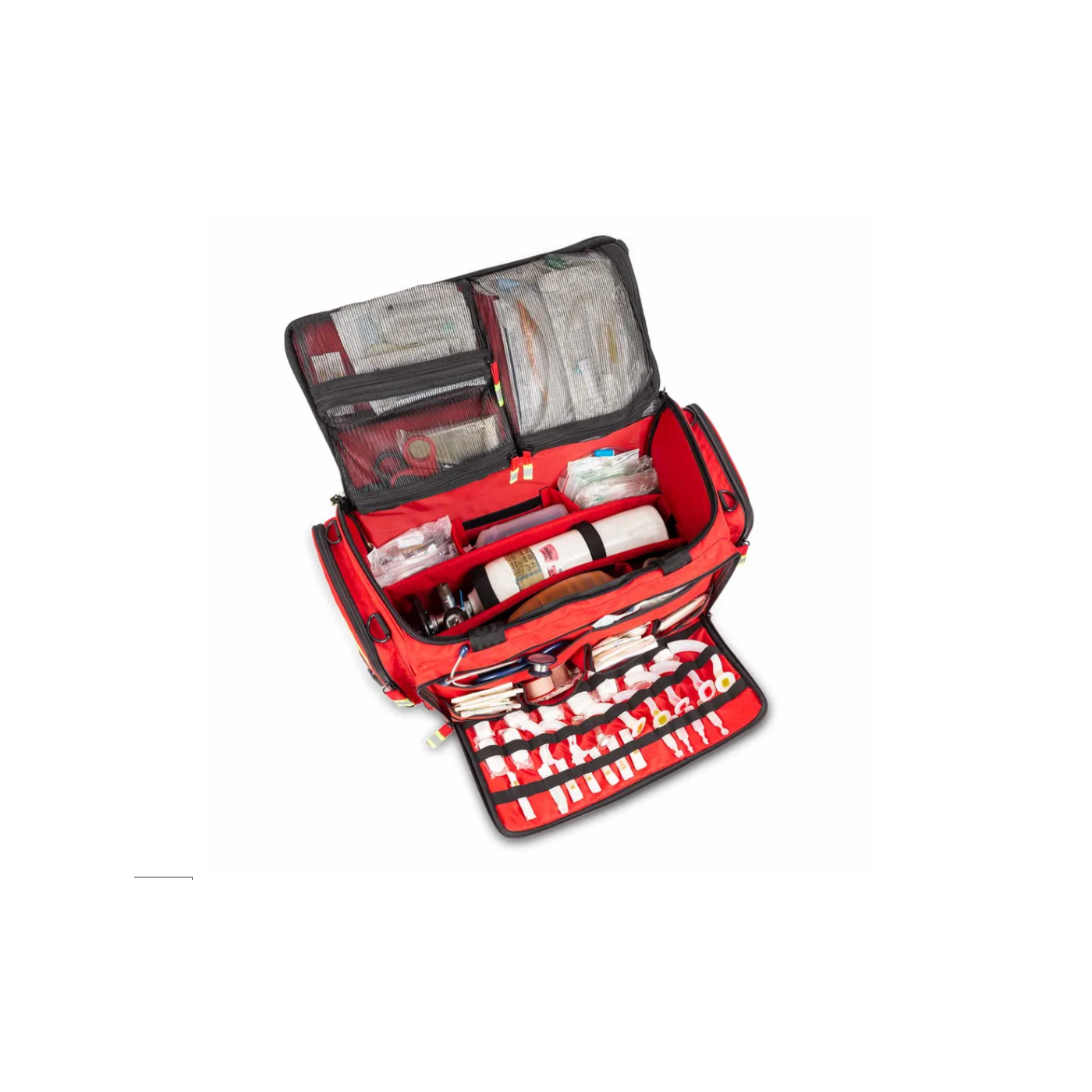 It accommodates both the oxygen bottle and all the medical supplies needed to care for critically ill patients. It features a removable panel with four sections and colored handles according to the international color code. The interior is fully adjustable thanks to its padded, removable velcro dividers.