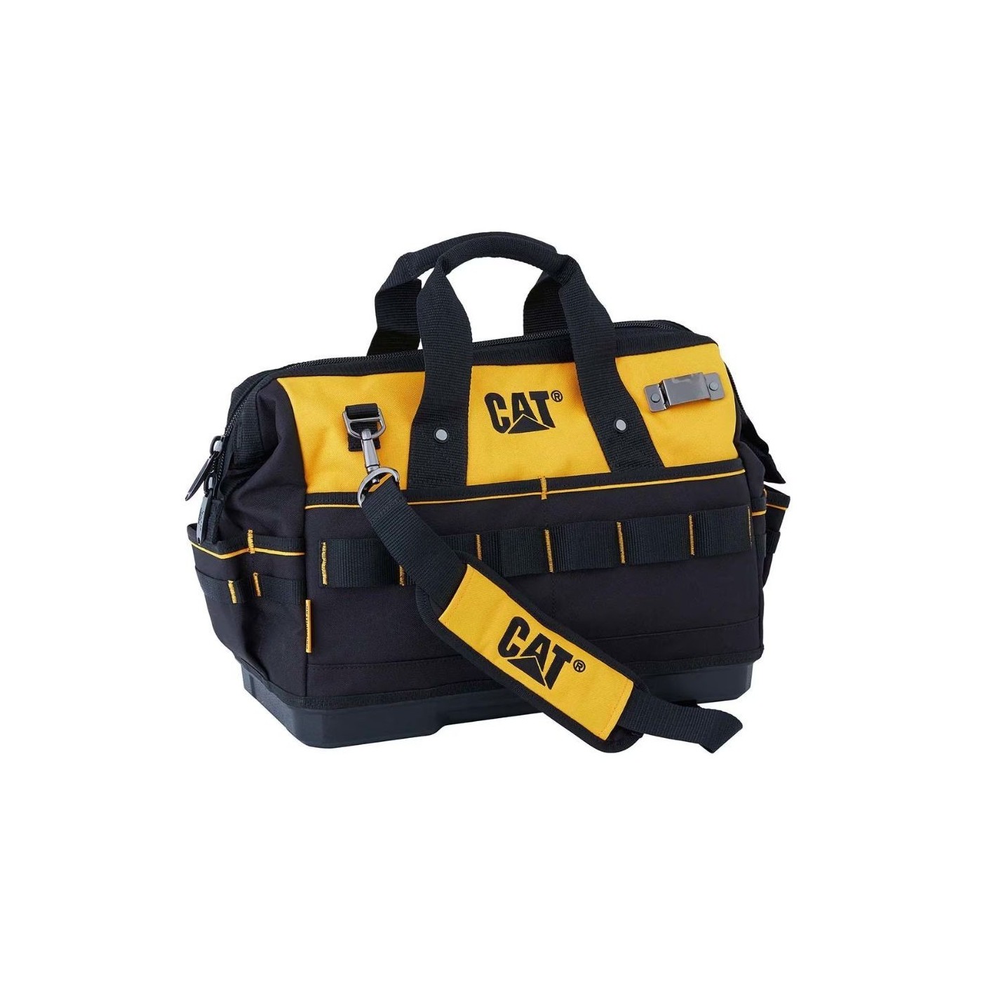 CAT 16” tool bag with rigid bottom, 30 compartments, wide top opening and padded strap. Durable and efficient.