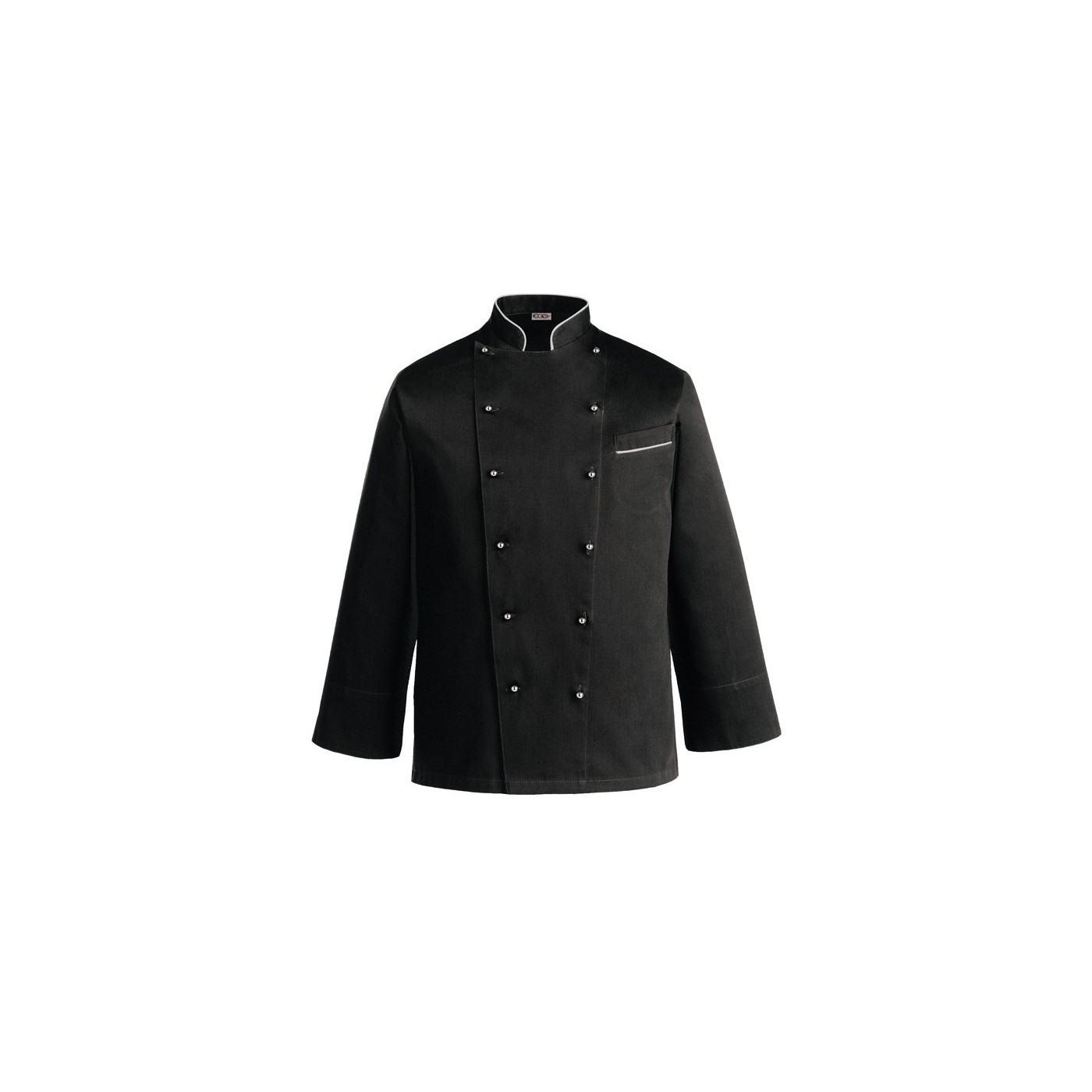 With Egochef, we make it easy to equip special extra-large size kitchen jackets. In this case, the Fat Boy black chef jacket with white trim and chest pocket.