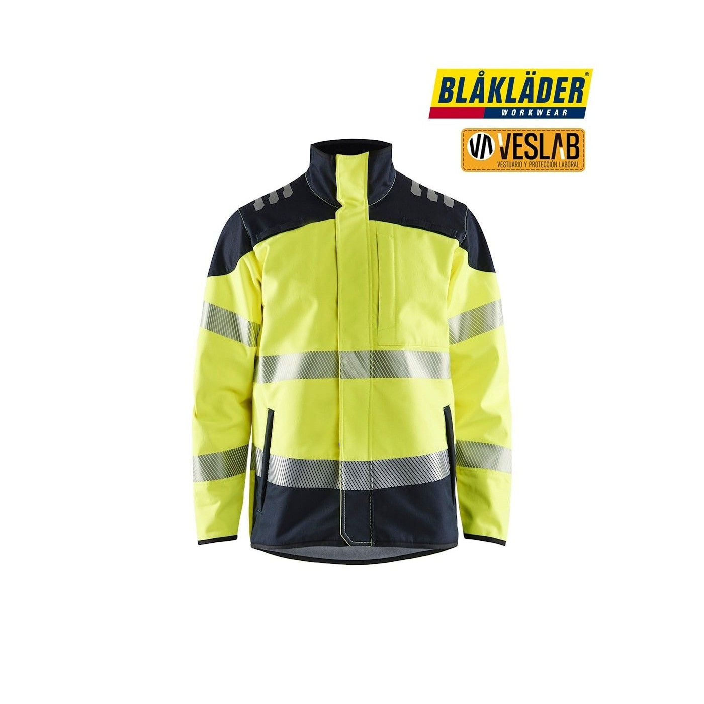 44% modacrylic, 29% cotton, 11% polyamide, 6% polyurethane, 5% polyester, 3% aramid, 2% anti-static, 3-layer softshell, flame retardant, anti-static, laminated, chemical splash proof (EN13034), 490g/m²