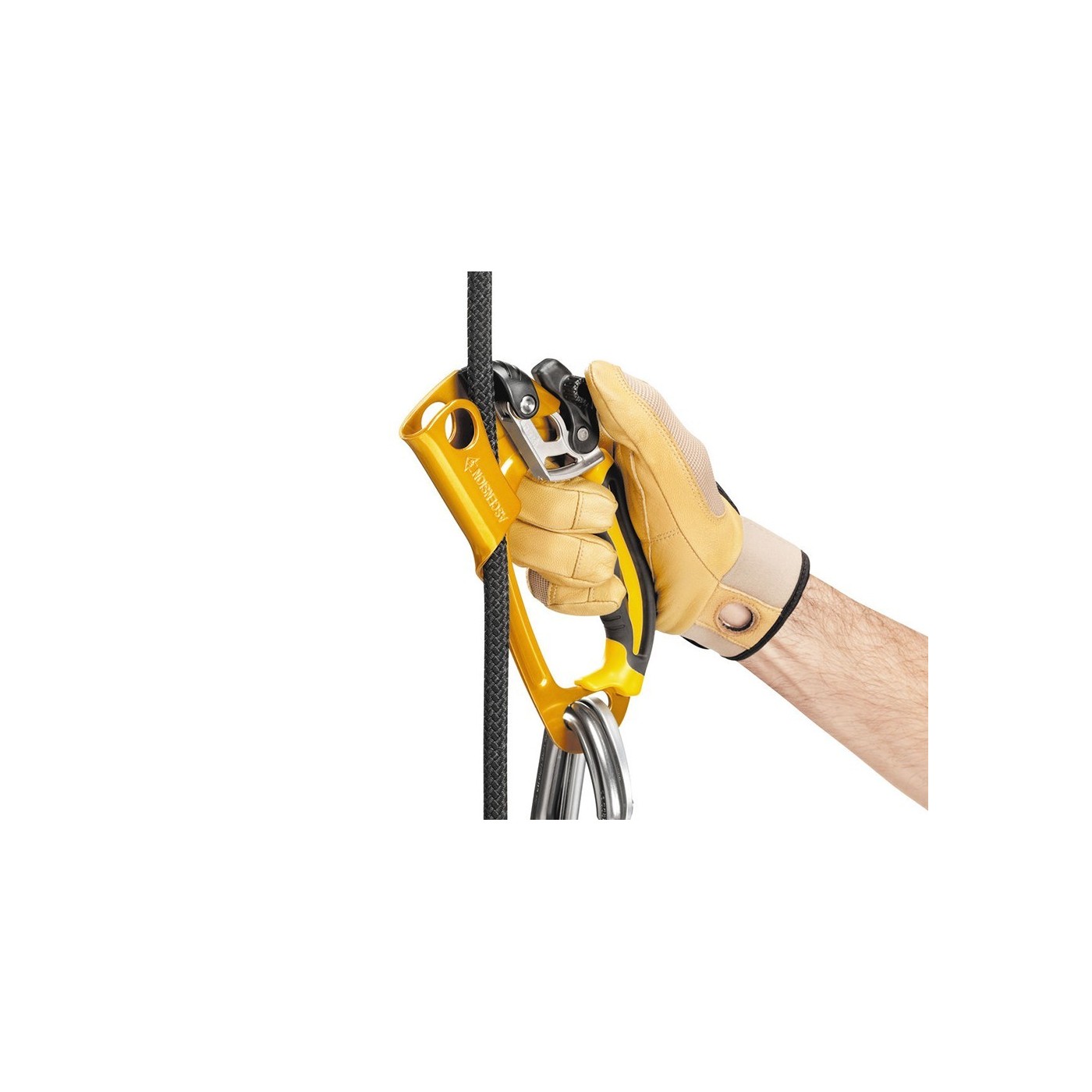 - upper hole for clipping a carabiner around the rope - Available in left- or right-handed and in black/yellow or black versions