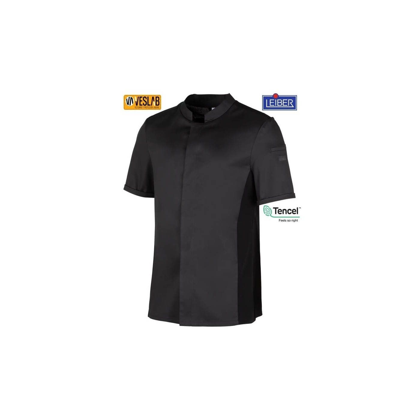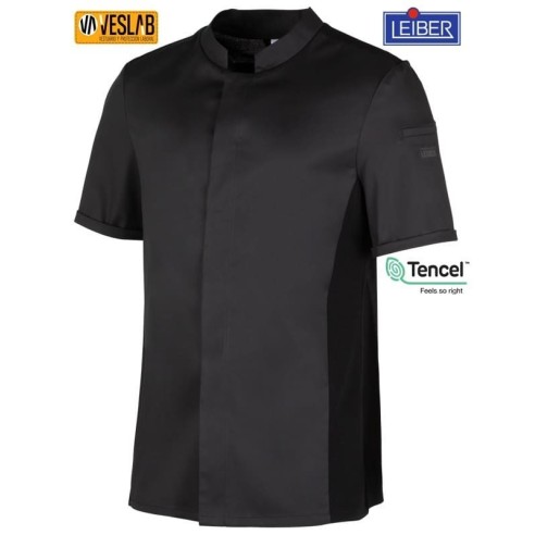 The CLYDE PIQUE M/C kitchen jacket is a garment designed for men, available in black and white colors. It is made with a combination of fabrics that includes 48% Tencel, 48% polyester and 4% elastane, which provides comfort and elasticity. It has Lyocell and polyester piqué sides, long sleeves with hidden snaps and a sleeve pocket. In addition, it has the LEIBER logo on the left sleeve and is suitable for industrial washing.