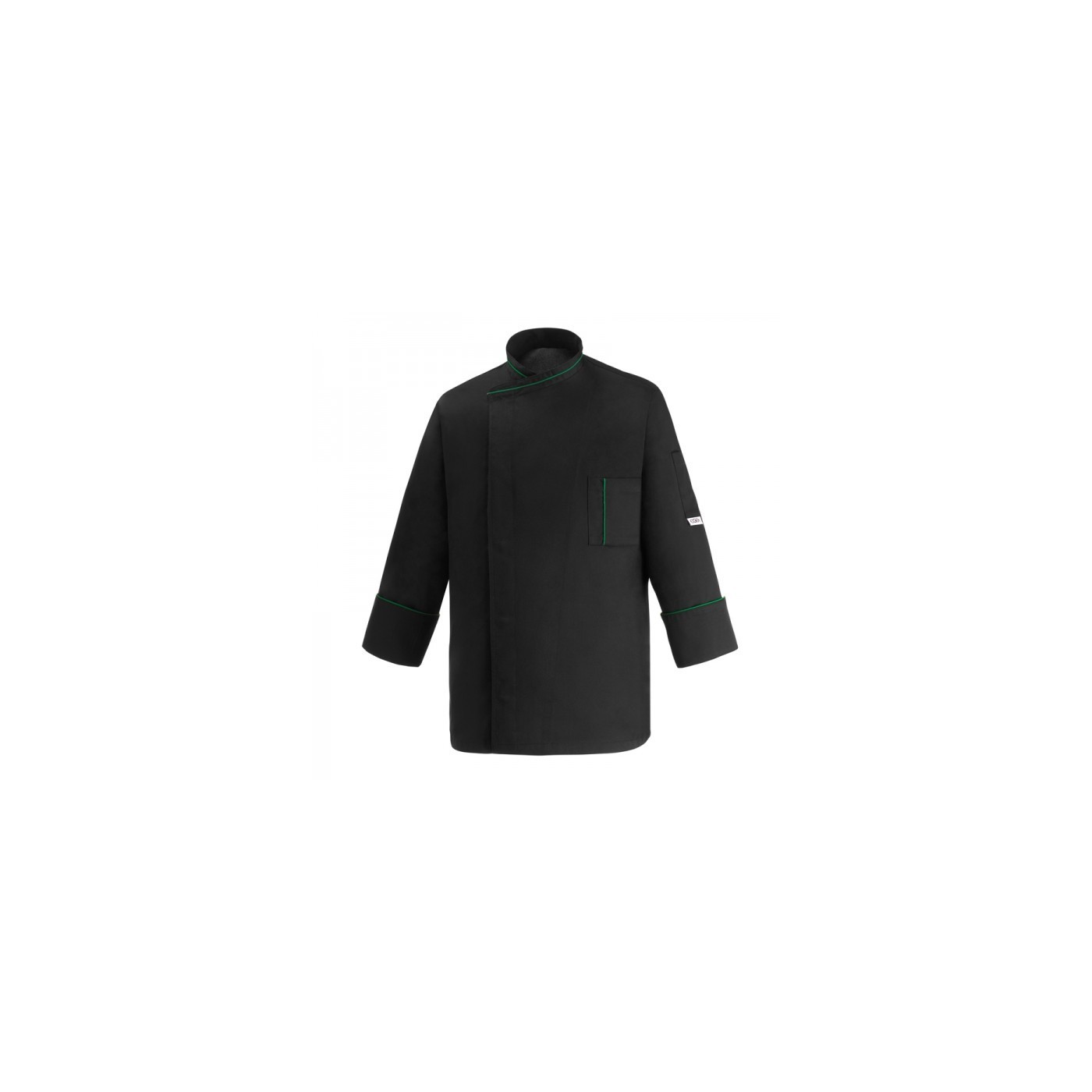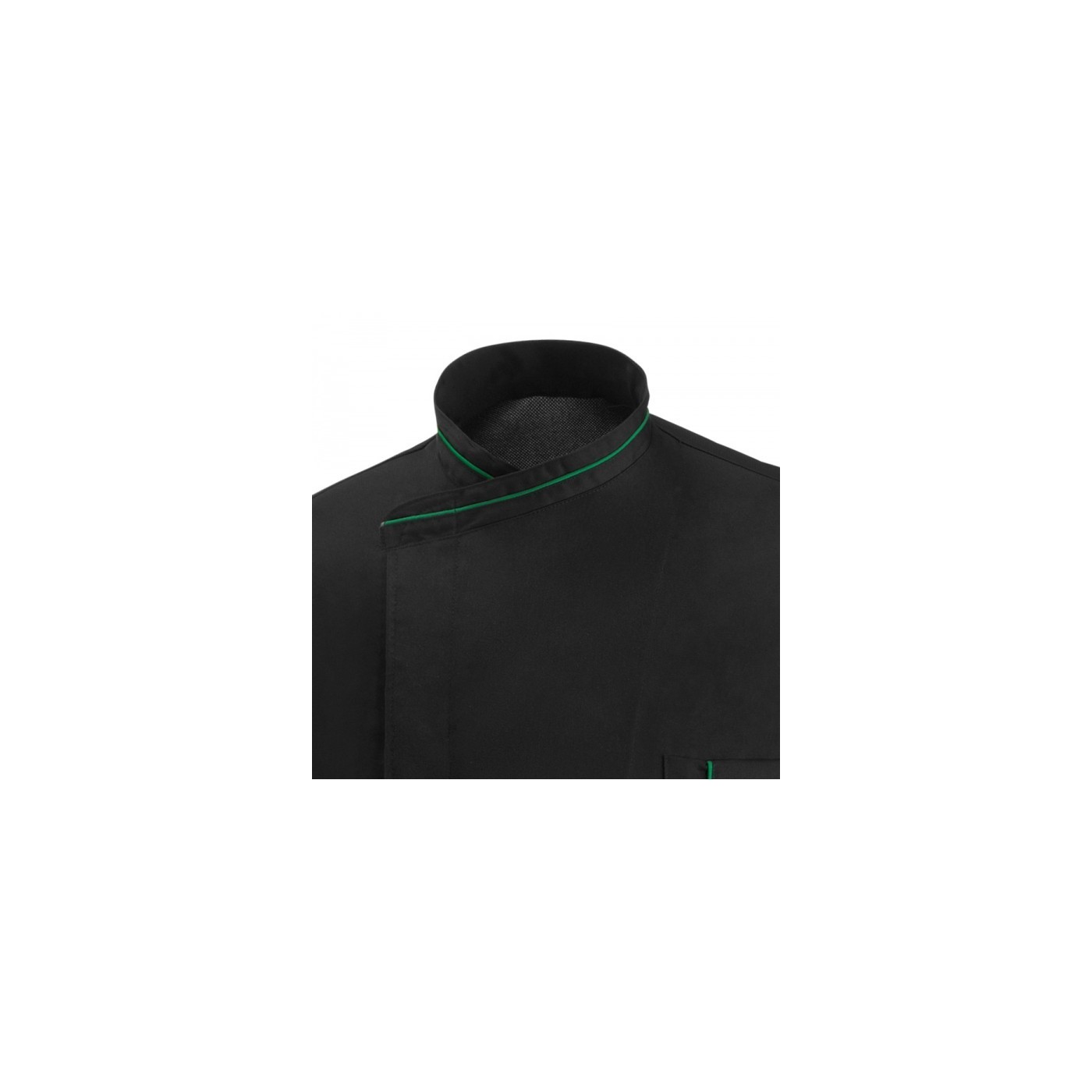 Technical jacket made of 100% recycled PET fabric . Black with green trim . Instant dry . Maximum absorbency and breathability. Back Air Cool + . Close hidden stainless brackets without skin contact .