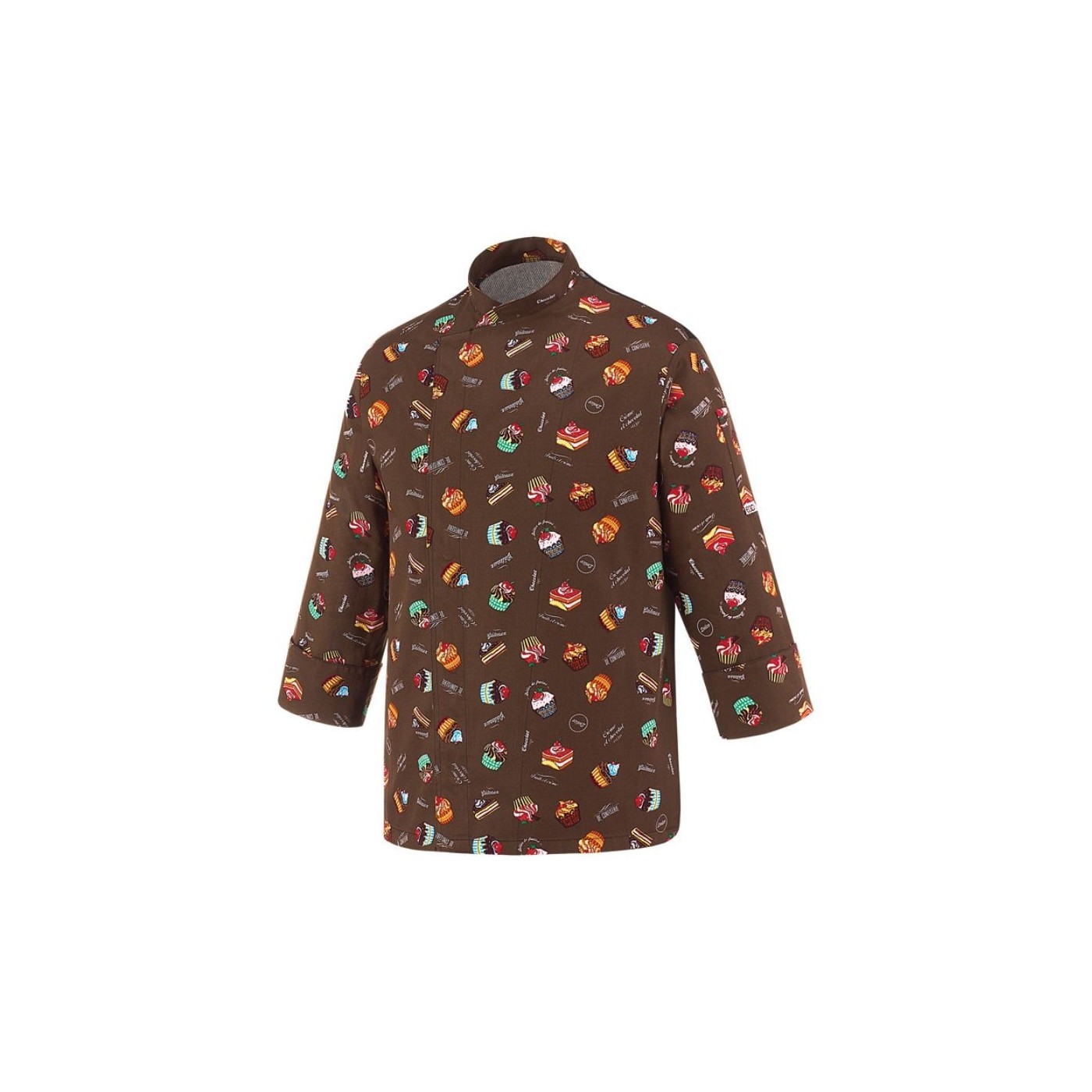 Chef Jacket Fantasy Sweets by Egochef, unisex, made of 100% cotton, featuring long sleeves, a sleeve pocket, Air Plus ventilation system on the back, and concealed snap closure.