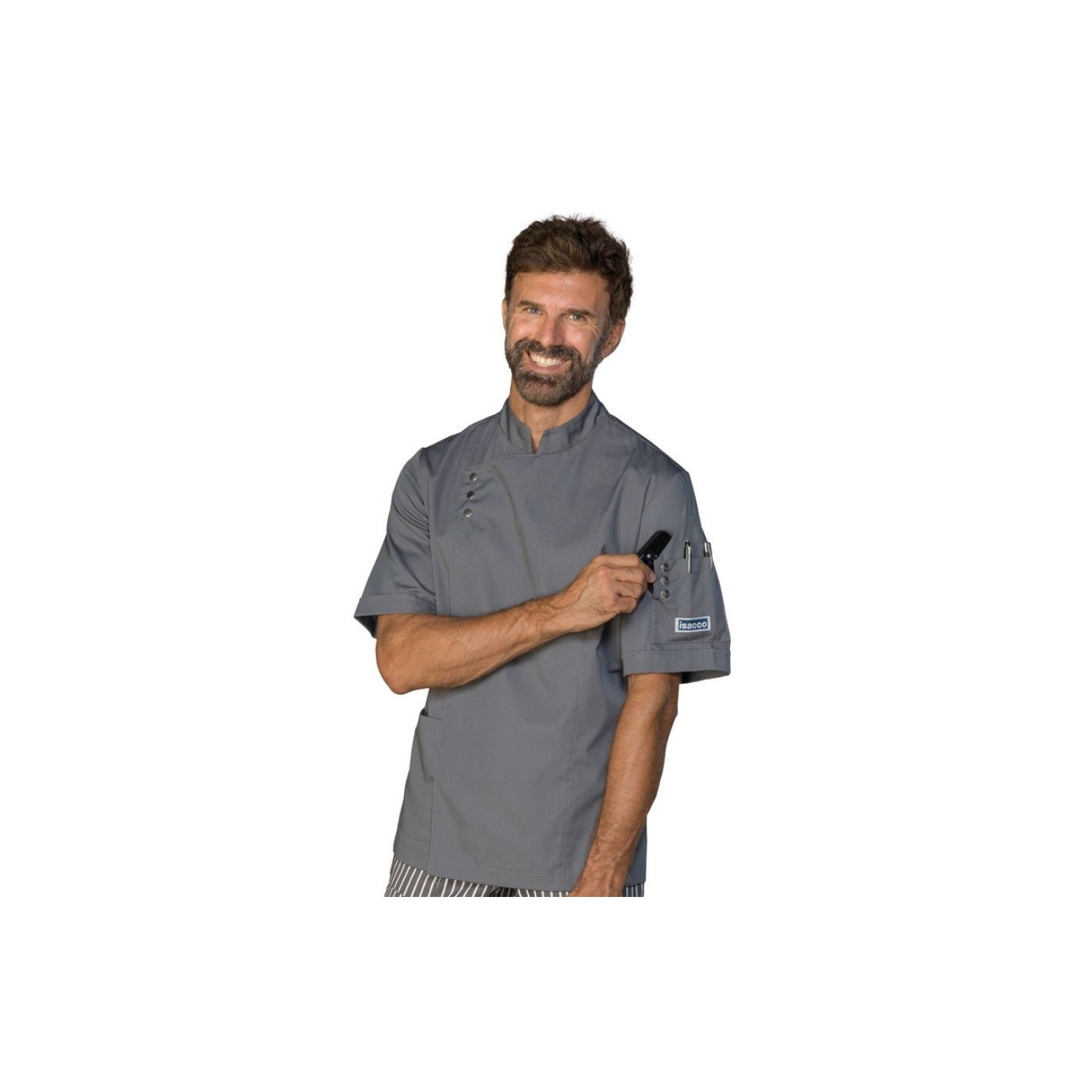 The Madrid Kitchen Jacket for men, combines 65% polyester and 35% cotton. With short sleeves, ventilation in the armpits, a mobile phone pocket and hidden snaps. Ideal for chefs and kitchen professionals.