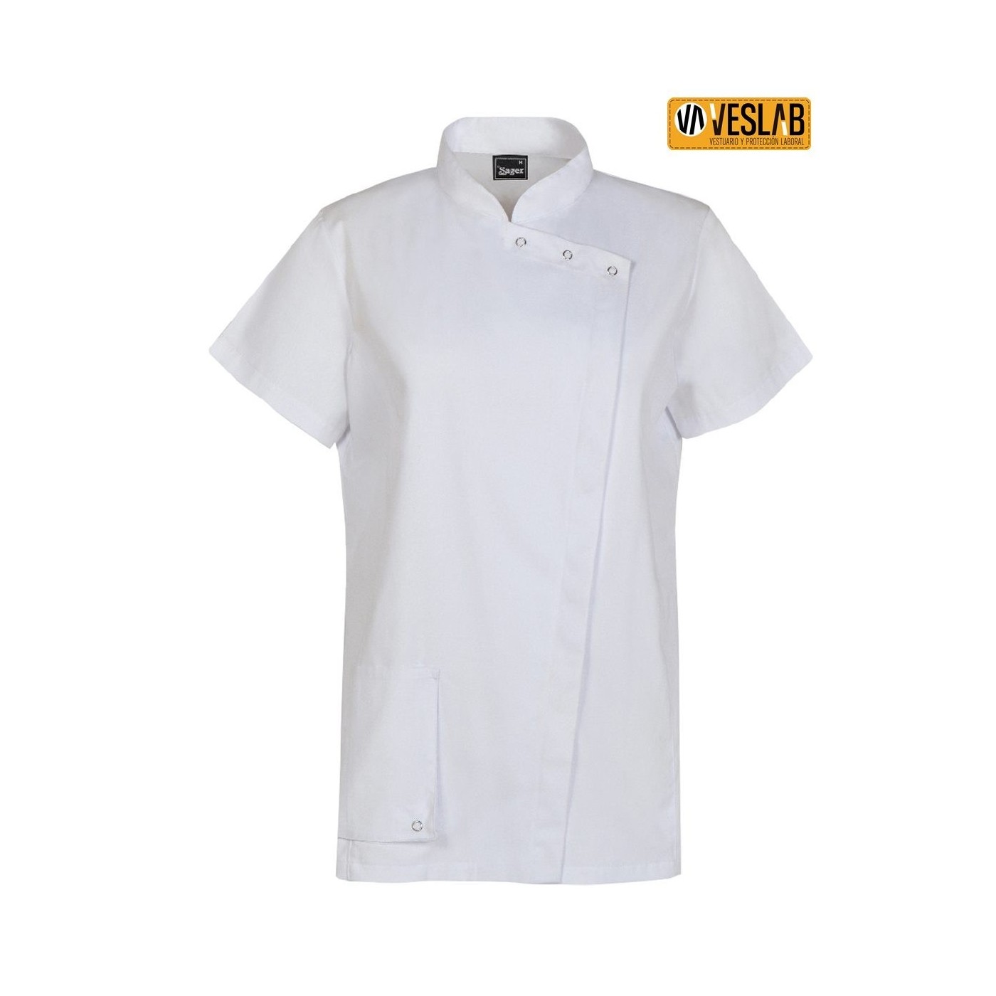 Elegant fitted kitchen jacket for women with short sleeves in mandarin collar and crossed kimono.