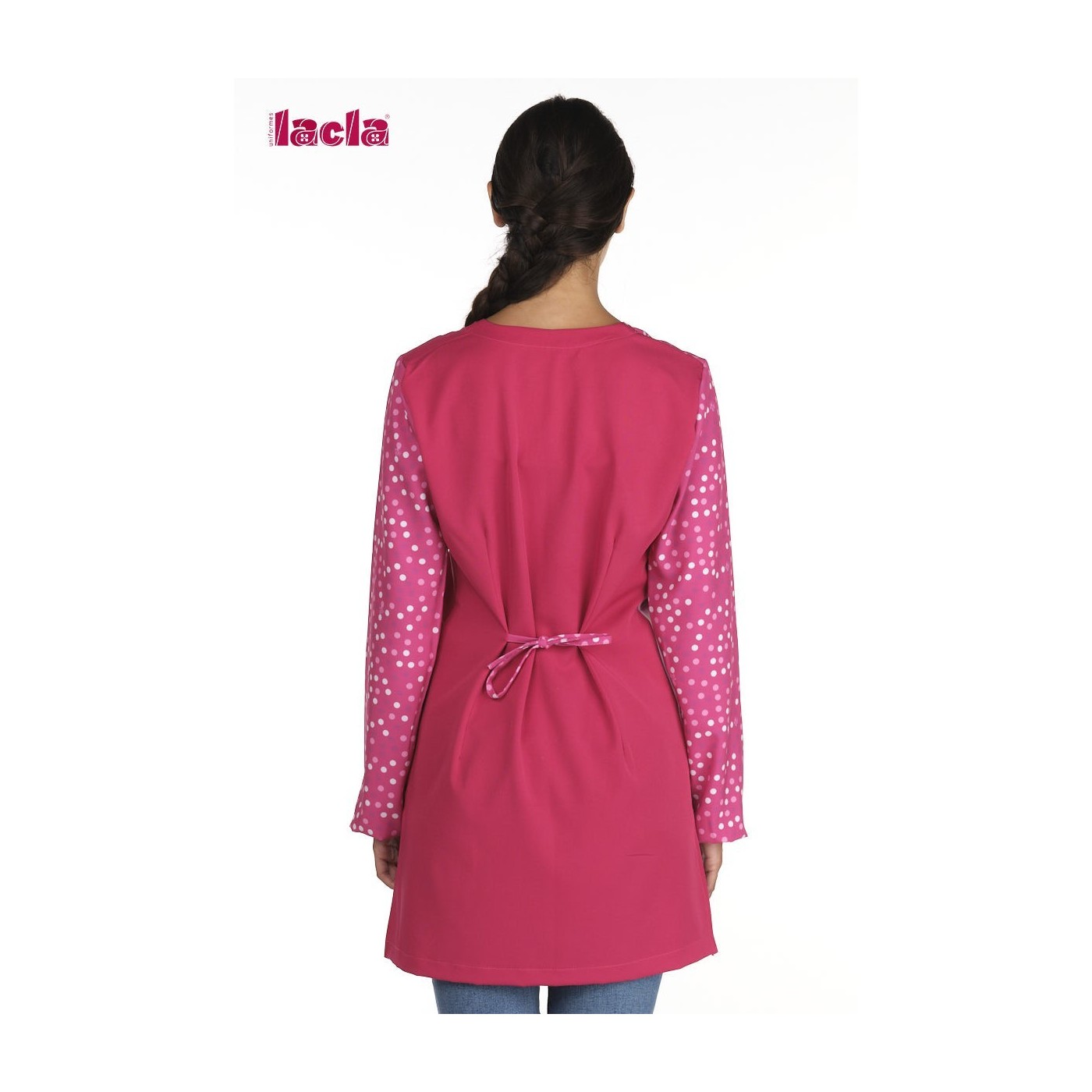 1 cross-over print front with zip, 1 plain pocket, crew neckline, side slits. Back with rear darts with ties to regulate the waist.