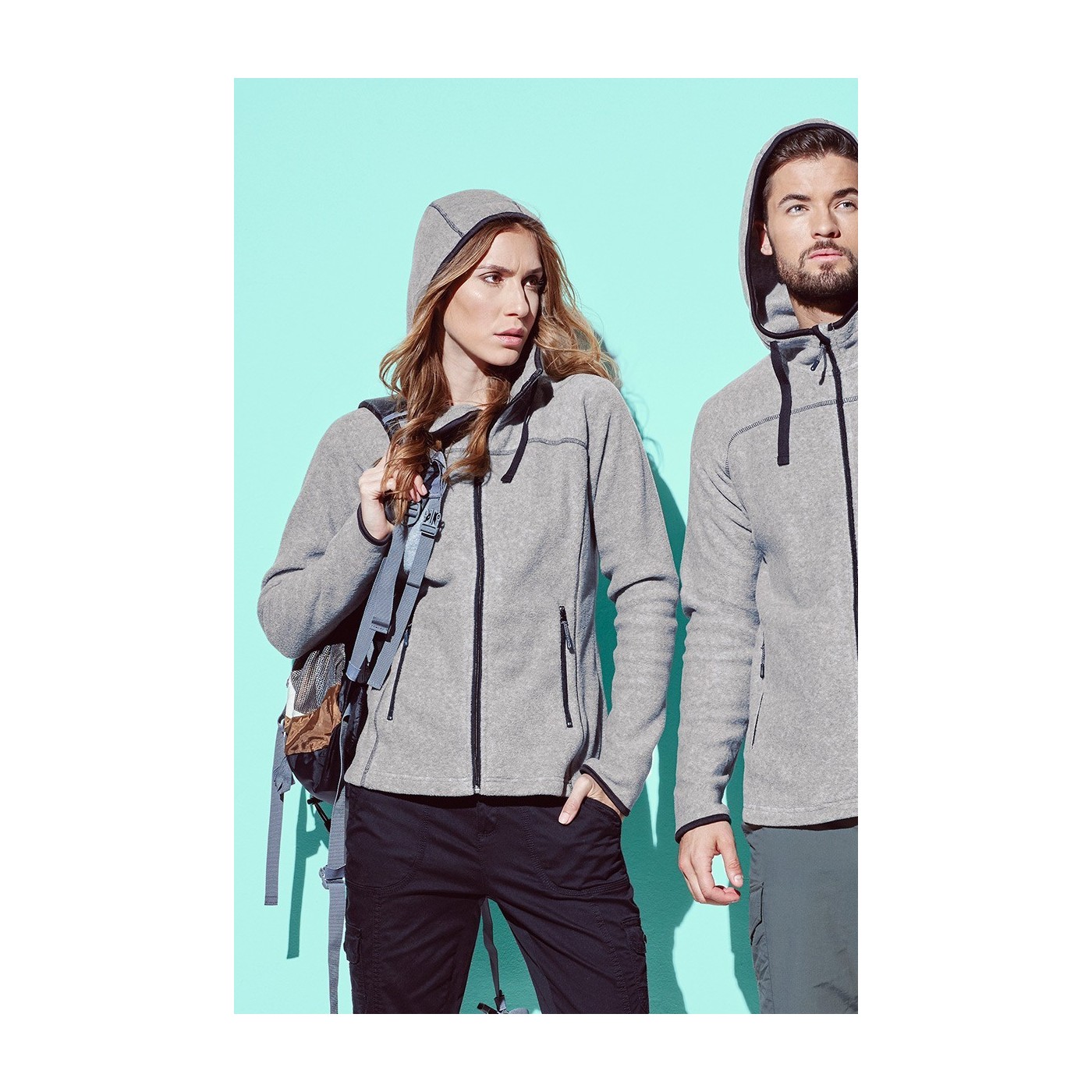 A medium-weight SUV! The thick fleece jacket combines excellent thermal insulation with a modern design: narrow cuffs, hood with high collar and zippers in contrasting color.