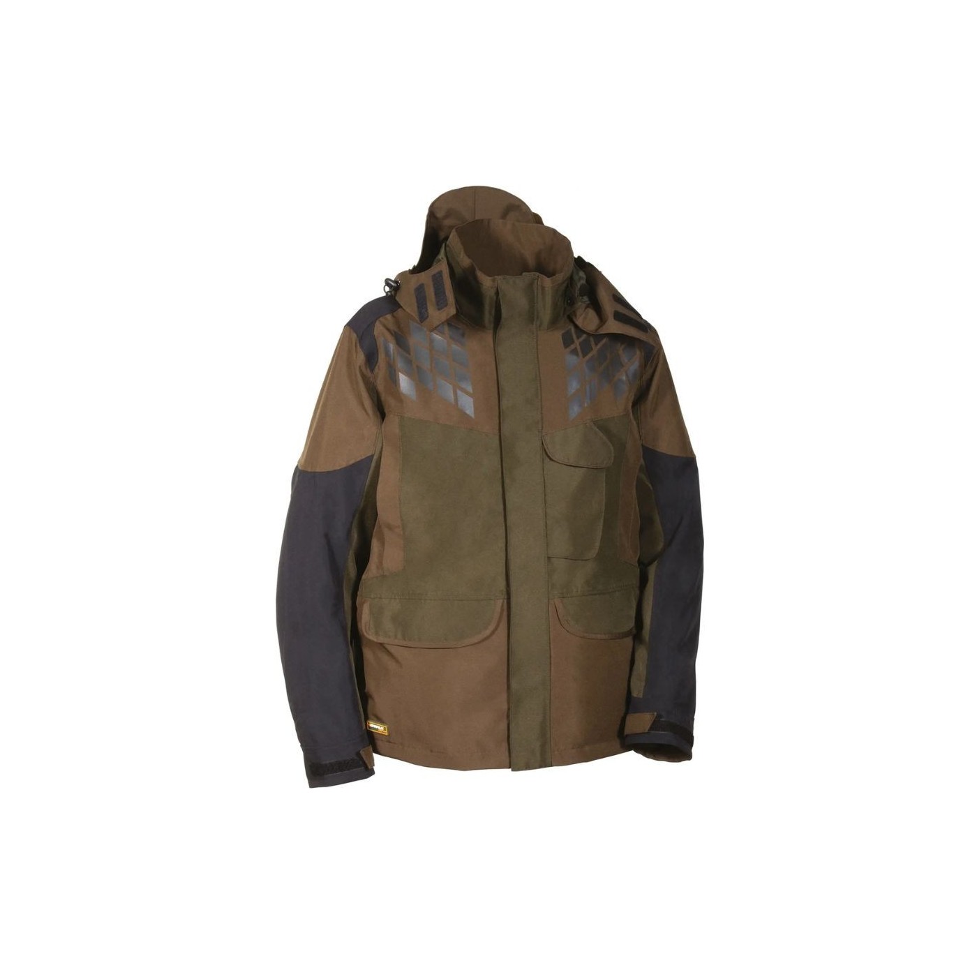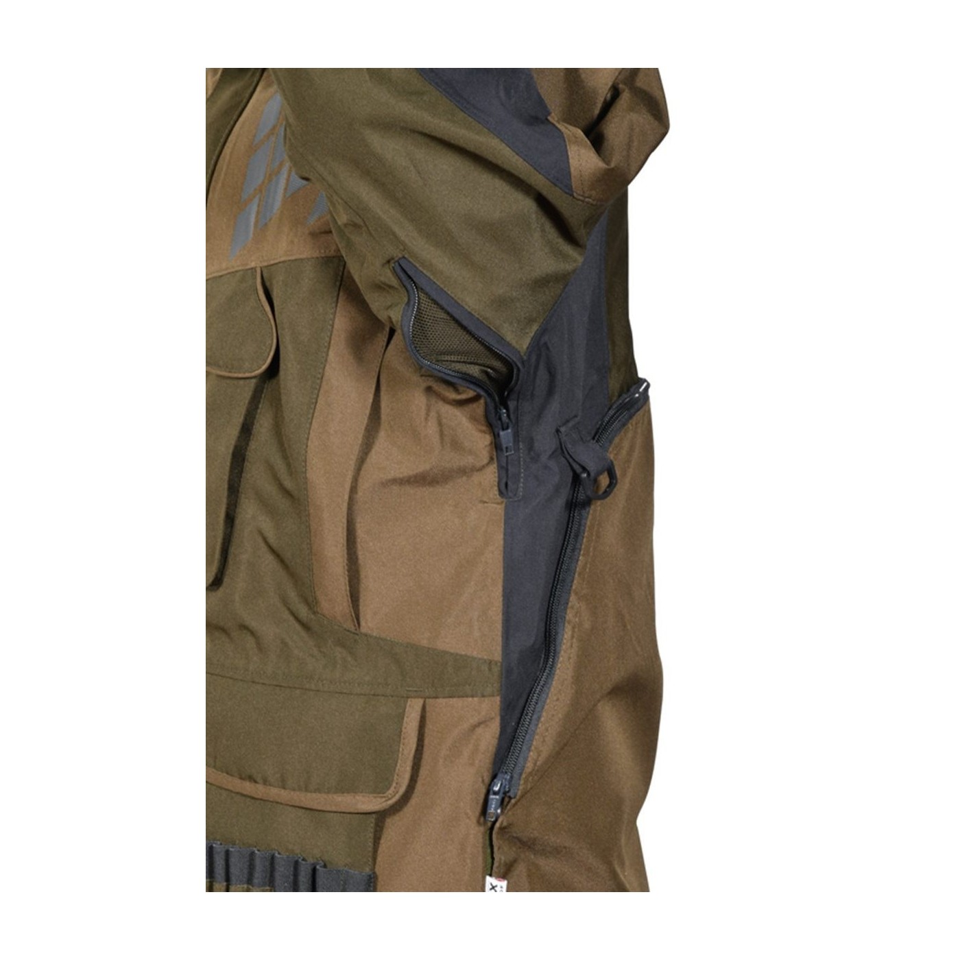 Windproof and waterproof jacket for hunting with shotgun holster.