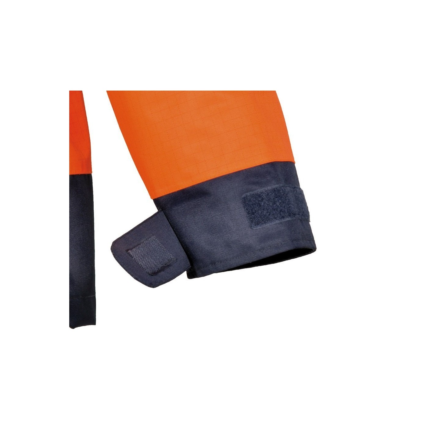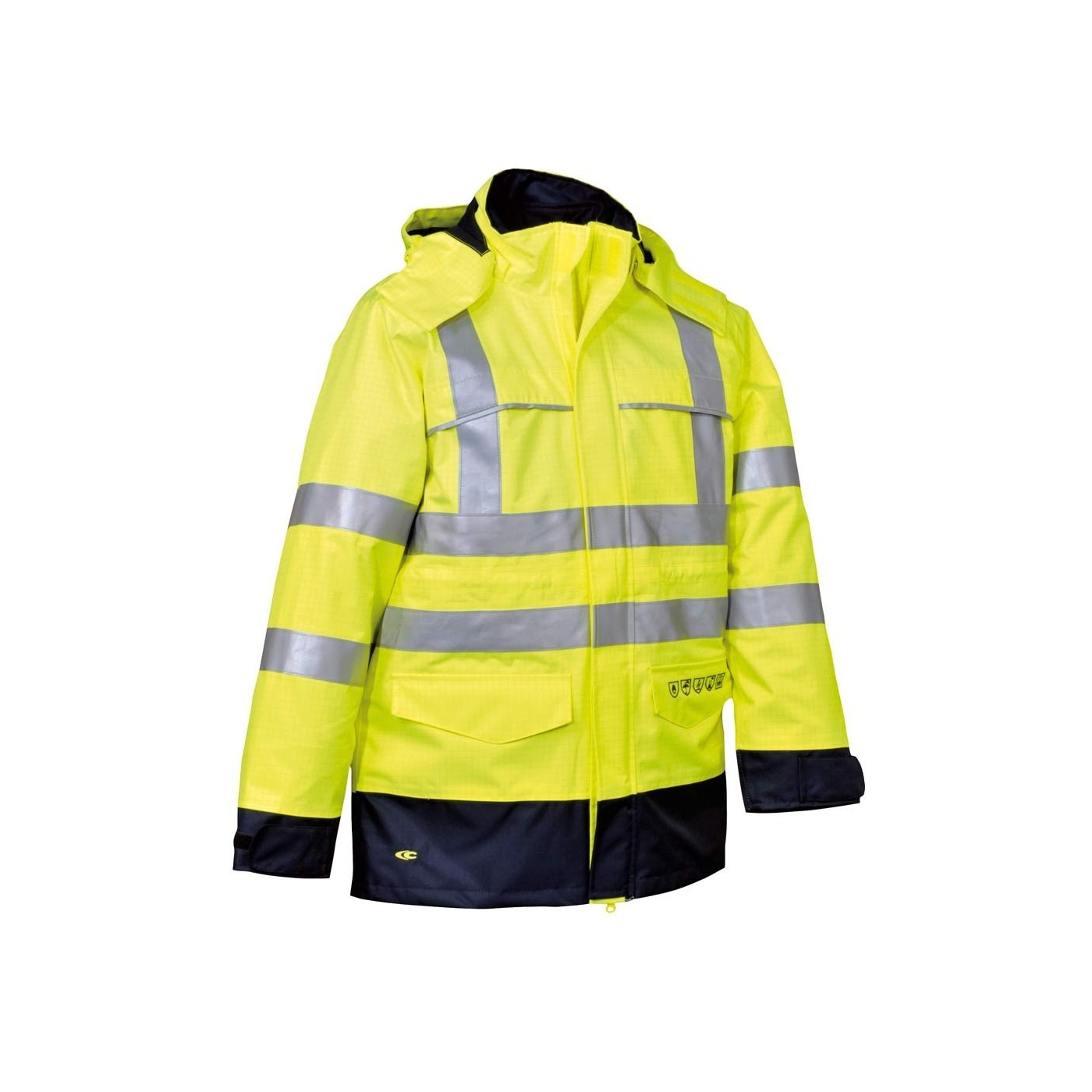 DESCRIPTION EXTERNAL PART: 2 breast pockets with velcro, 2 pockets with flap and velcro, 3M™ Scotchlite™ Reflective Material flame-retardant reflex strips - 8935 Silver Fabric, adjustable and detachable hood, adjustable cuffs with velcro, adjustable waist with coulisse, fast opening with zip, garment suitable to be used in ATEX, internal bottom zip, pictograms standards embroidered on the front pocket, thermo welded seams