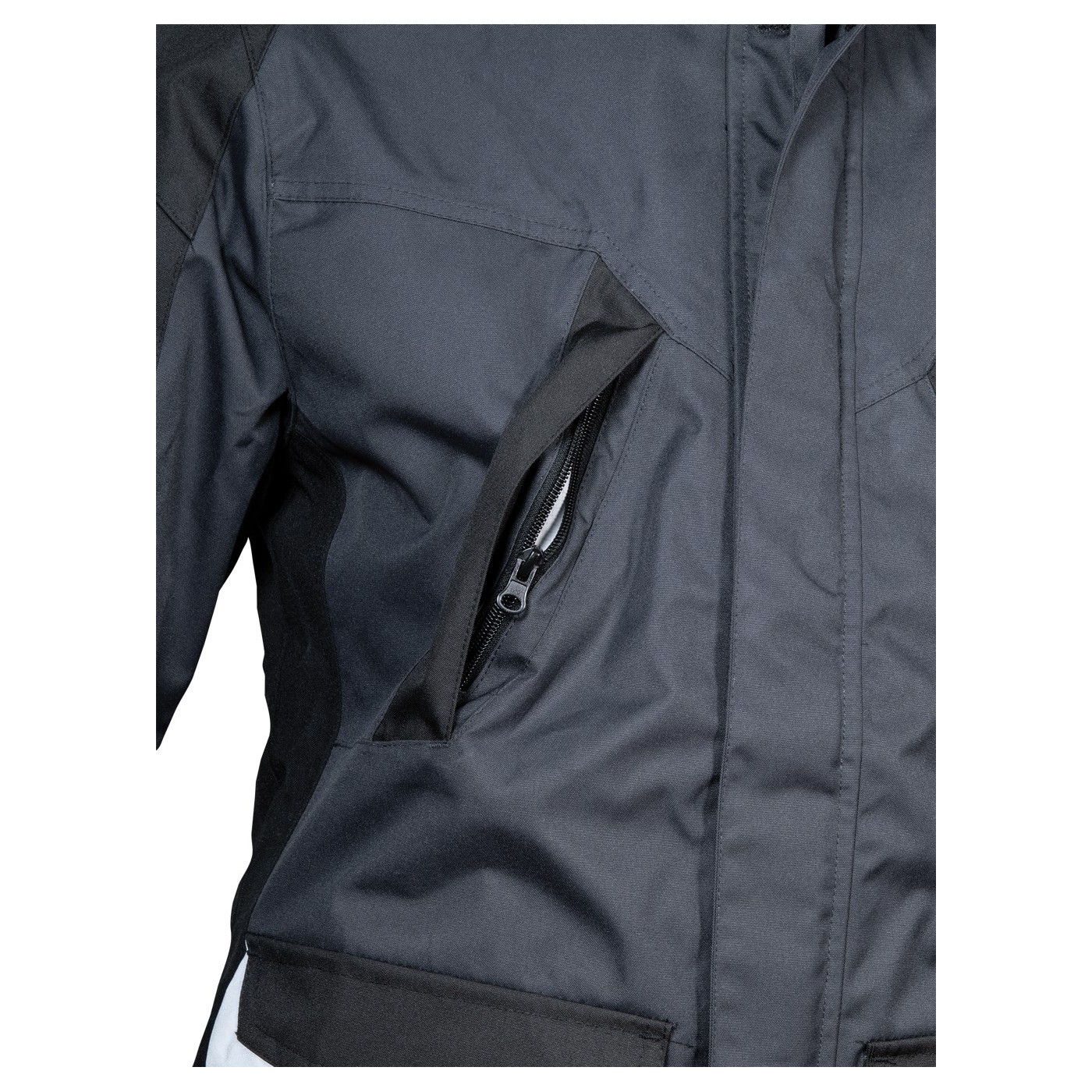 EXTERIOR DESCRIPTION OF THE GARMENT: 1 pocket on the left sleeve with zip closure, 2 large pockets under the garment with velcro, 2 chest pockets, one of which is a cell phone holder with E-WARD, 2 pockets interiors one with zip closure, garment bottom with zip closure, adjustable and removable hood, ergonomic cut of the sleeves, heat-sealed seams, elastic inserts on the sides and on the back, reflective inserts, adjustable cuffs with velcro