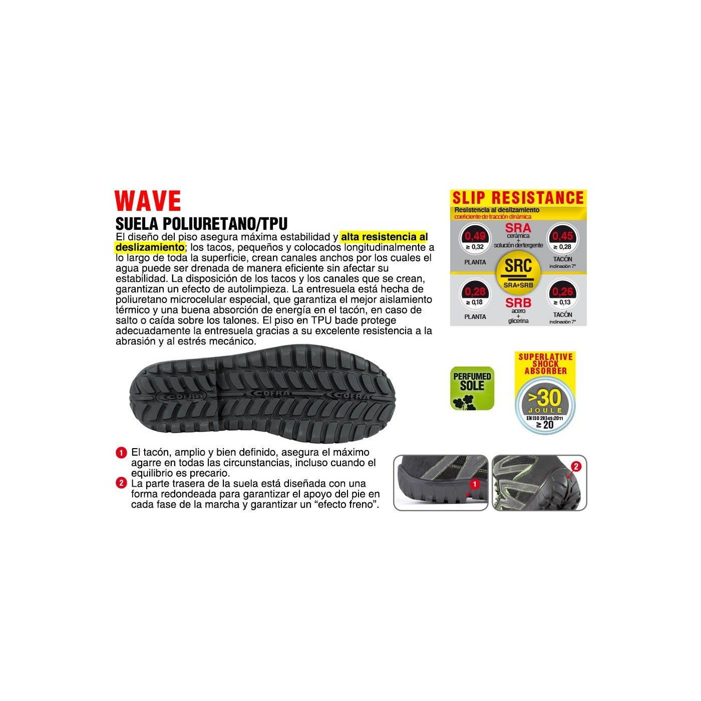 FOOTBED: COFRA SOFT, footbed made of scented polyurethane, holed, antistatic, anatomic, soft and comfortable; the shape of the bottom part guarantees impact energy absorption (shock absorber) and high grip; the upper part absorbs moisture and keeps the foot dry