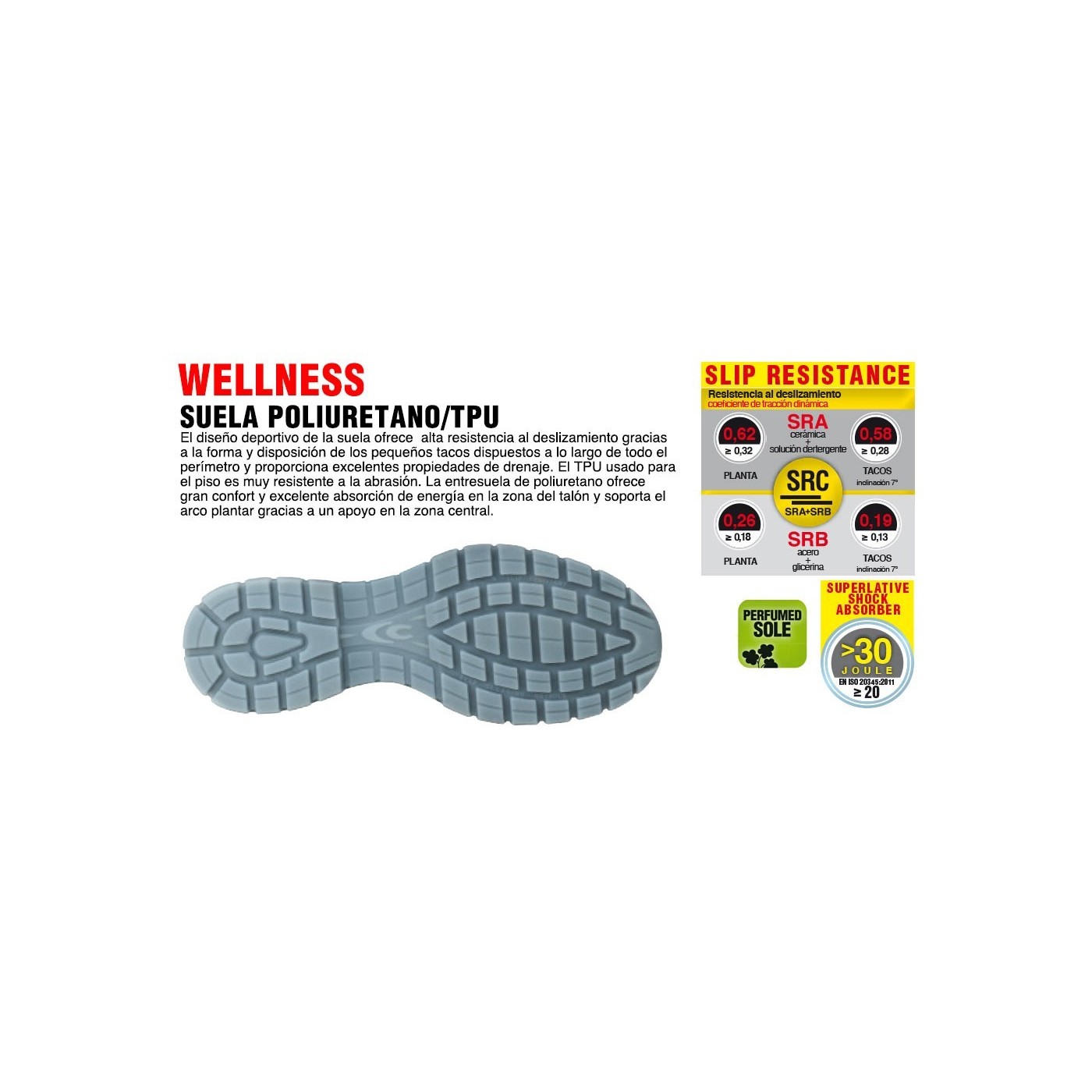 FOOTBED: COFRA SOFT ESD, made of scented polyurethane, holed, anatomic, with low electric resistance, soft and comfortable; the shape of the bottom part guarantees impact energy absorption; the upper part absorbs moisture and keeps the foot dry