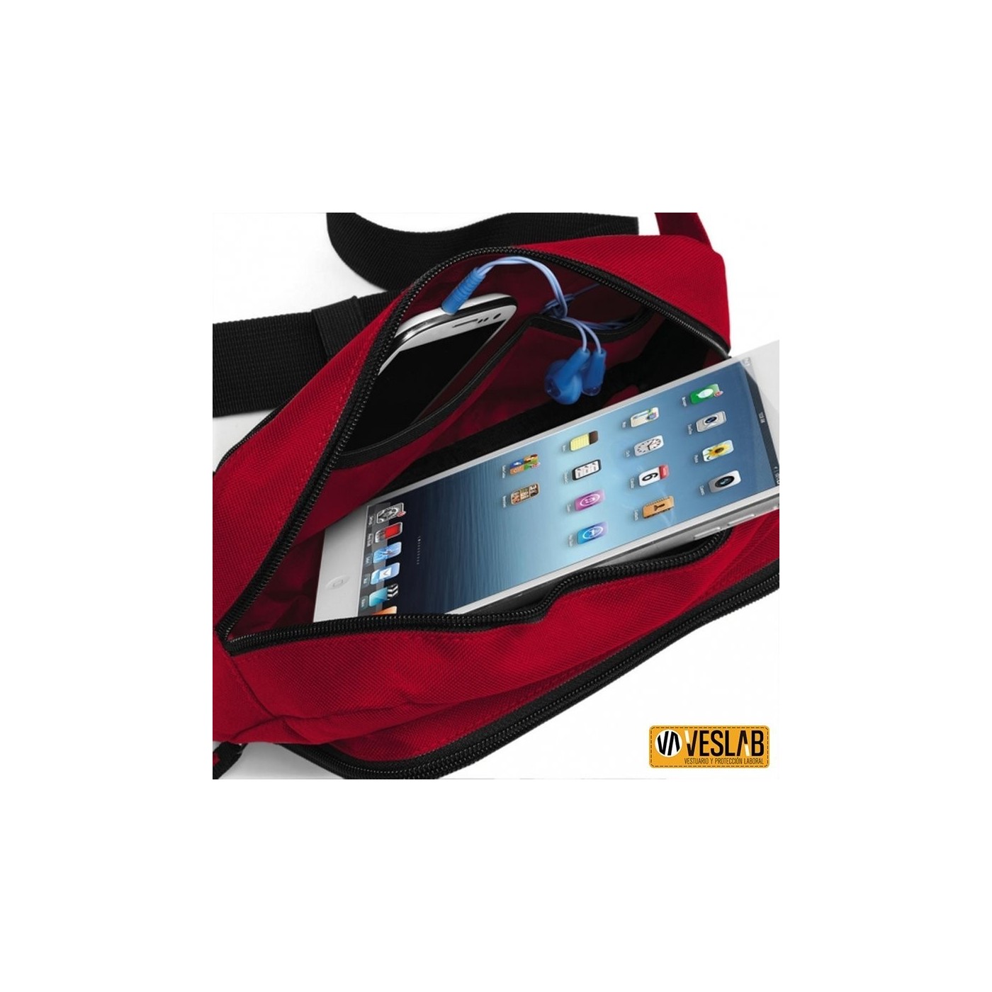 Practical fanny pack made of 100% polyester fabric (600D). It has an adjustable belt, back pocket with zipper and interior mesh pocket.
